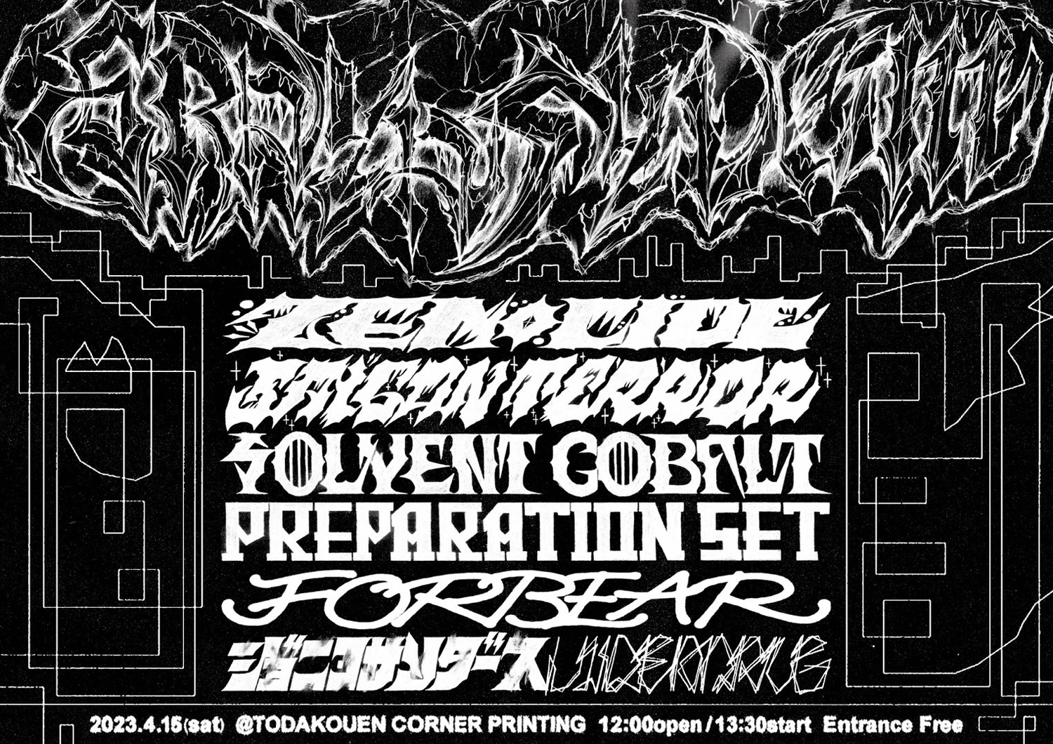 昨年11月に東京・新大久保 EARTHDOMにて開催された第7回にはAIWABEATZ x QUEER NATIONS、BEEF TANNEN、GRAVAVGRAV、HOTVOX、IMMORTAL DEATH、SAIGAN TERRORらが出演して好評を博した「GRAYASYLUM」。戸田公園 CORNER PRINTING内に新たに建造されたライヴ・スペース(CORNER PRINTING SELF 戸田公園店2F)での開催となる第8回では、Forbear、preparationset、SAIGAN TERROR、SOLVENT COBALT、ZENOCIDEのライヴ・パフォーマンスと、ジョニコサンダース、VIDEODRUGによるDJが予定されています。