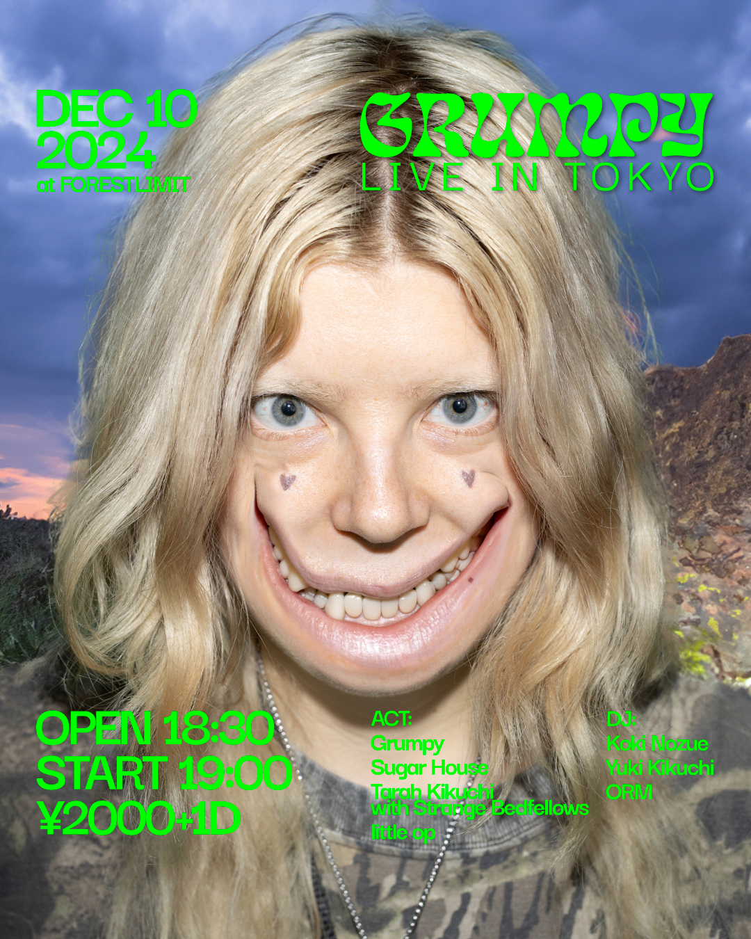 YeuleやFrankie Cosmos、Kinlawらの作品でおなじみのDustin Payseur(BEACH FOSSILS)主宰レーベル「Bayonet Records」から10月に新作EP『Wolfed』をリリースしたばかりのGrumpy。来日公演ではGrumpyに加え、Sugar House、Tarah Kikuchi with Strange Bedfellows、little opがライヴ・パフォーマンス。DJとして『ORM』、Yuki Kikuchi、野末光希(WAREHOUSE TRACKS)が出演します。