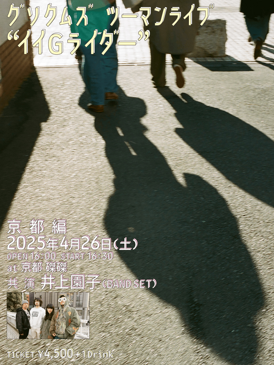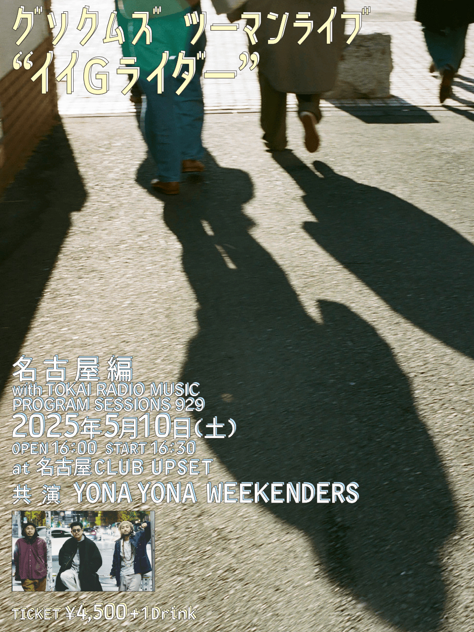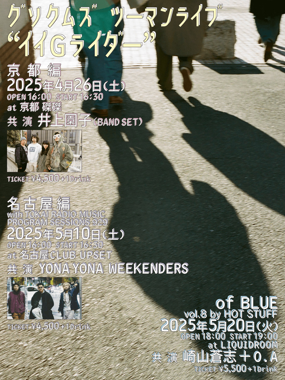 全国7都市で開催されたワンマン・ツアー「夢に飛びのって」の最終公演を1月18日に東京・恵比寿 LIQUIDROOMにて終えたばかりのグソクムズが、2マン・ライヴ「イイGライダー」を2都市で開催。