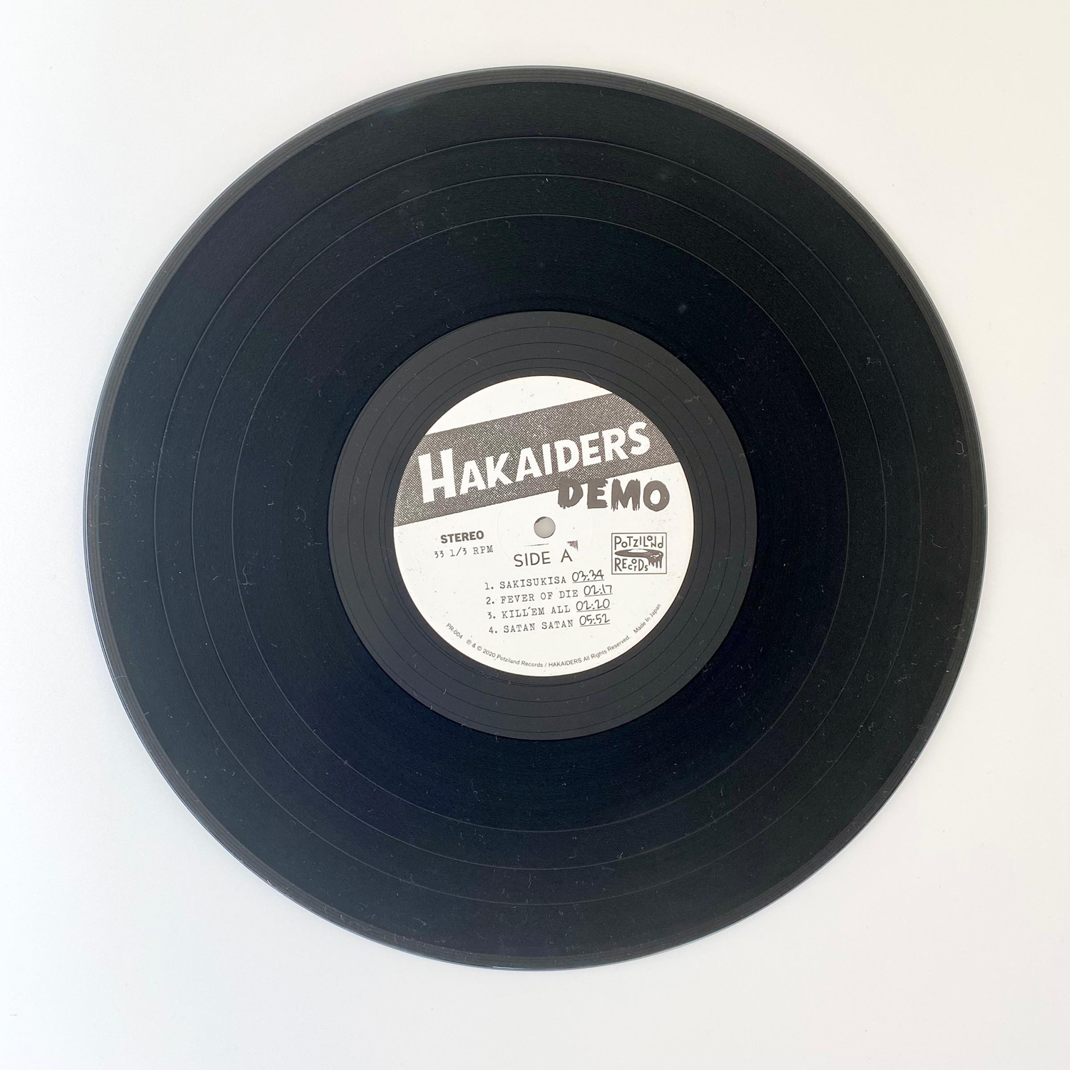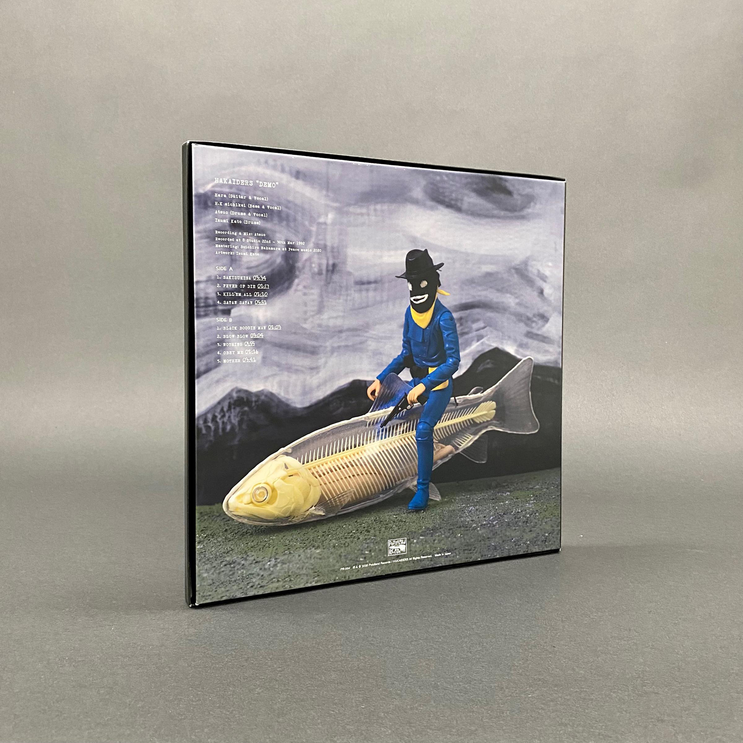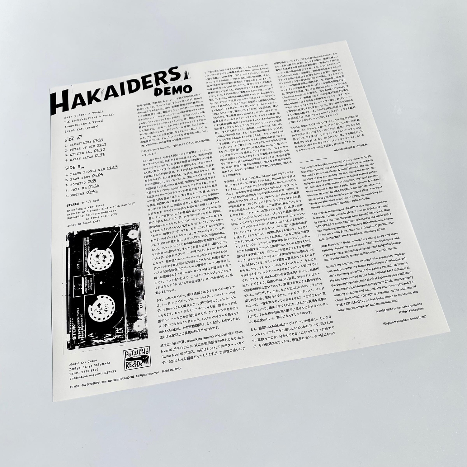 Atsuoによるレコーディング / ミキシングのオリジナル音源を中村宗一郎(Peace Music)がリマスタリングした12″ヴァイナル『DEMO』は、LP Box Set(18,000円 + 税)と通常盤(4,500円 + 税)の2形態で発売。限定300セットのLP Box Setは、180gヘヴィウェイト・ヴァイナルに加藤の作品を多数掲載した12頁のリーフレットを同梱。デザインは加藤の作品集も手がける重実生哉が担当し、アートブックの要素も併せ持つパッケージとなっています。ライナーノーツは当時のHAKAIDERSを目の当たりにした元「WARSZAWA」ショップスタッフ・小林英樹によるもの。