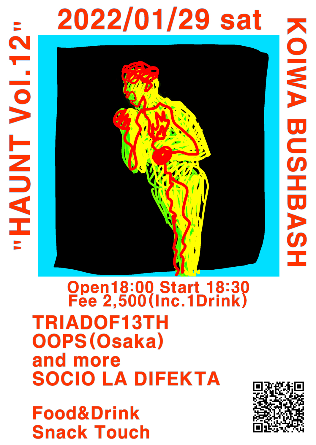 fuelphonic(野本直輝 + 坂田律子) + 伊東篤宏、角矢胡桃(HYPER GAL, 豊田道倫 & His Band)、増子真二(DMBQ)、SOSOS CLUB(村上ゴンゾ + 藤原草太朗)らを迎えた昨年10月の「Vol.11」以来の開催となる「Vol.12」には、2020年にピーチ岩崎とのスプリット作品をリリースして好評を博したモリカワアツシ(ex-idea of a joke, estrella 20/20, SO WHAT, younGSounds)率いるand more、イラストレーターとしても活躍するヨコタミナミ(Jocko)を新メンバーに迎えてからは初の音源『OOPS demo』を昨年11月に発表したOOPS、林原敦志(GOUM, JDOW, MACROCHORDZ, PARALYZED | 東京・国分寺 MORGANA)、宮部幸宜(AKBK, ENDON, PRAYMATE)、田中佑来 aka extremeOBSN(suthpire、Whales、ZENANDS GOTS)によって結成され、昨年9月のフル・アルバム『曲がり角 ニオイ 夢の夜』で全貌を現したTRIADOF13THが出演。ライヴ・イベント「ライフイズミュージック」のオーガナイザー・たっちによる投げ銭制のフード / ドリンク「スナックたっち」の出店も予定されています。フライヤー・アートは、11月にBUSHBASHにてdead ももかとのエキシビションを開催したコズエ(fineday)によるもの。
