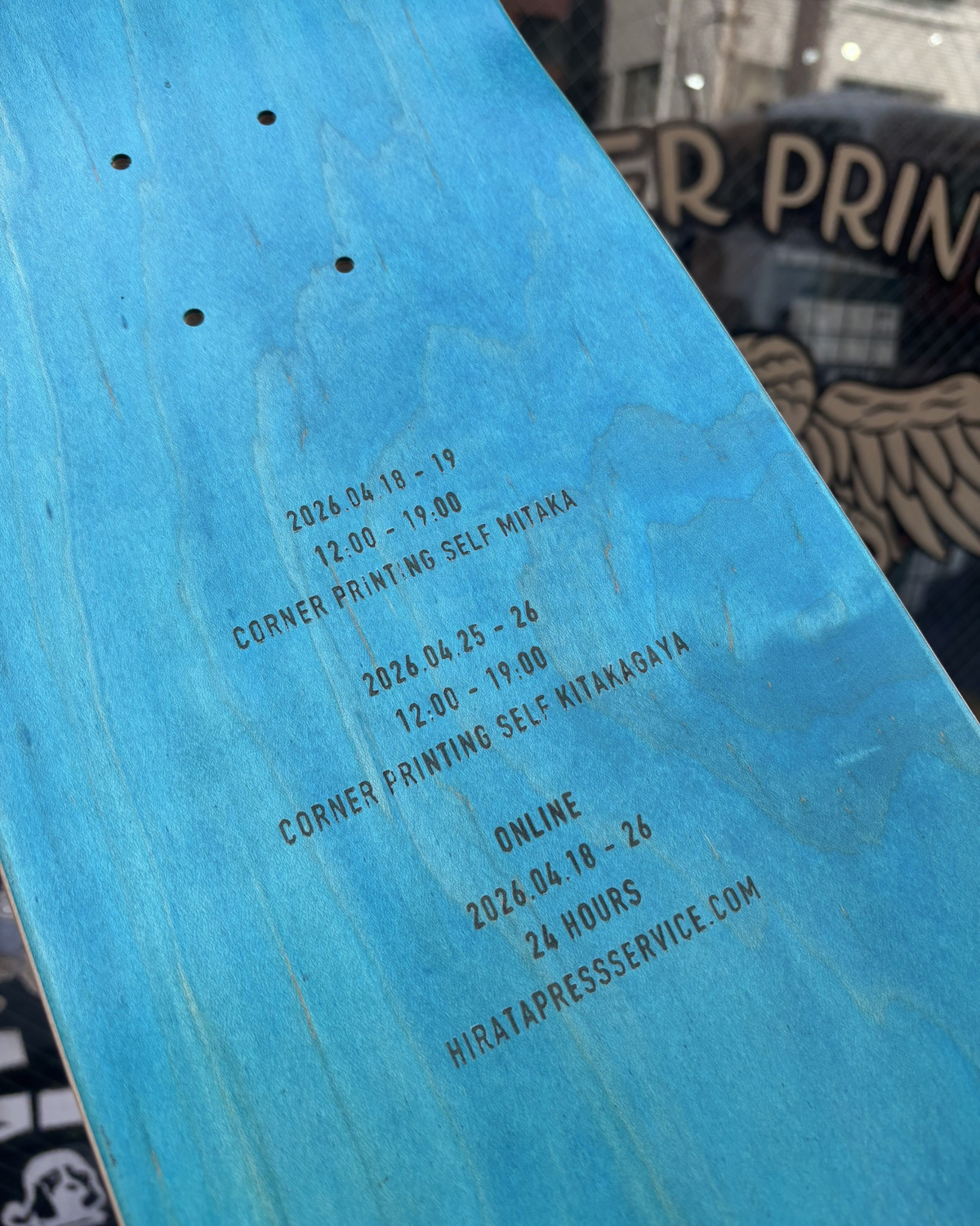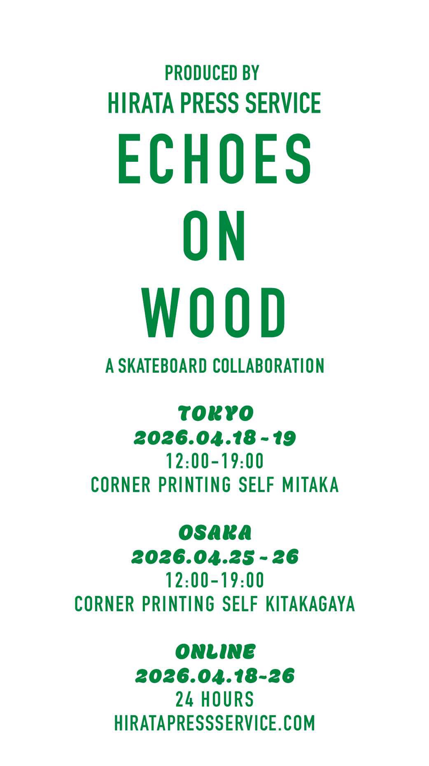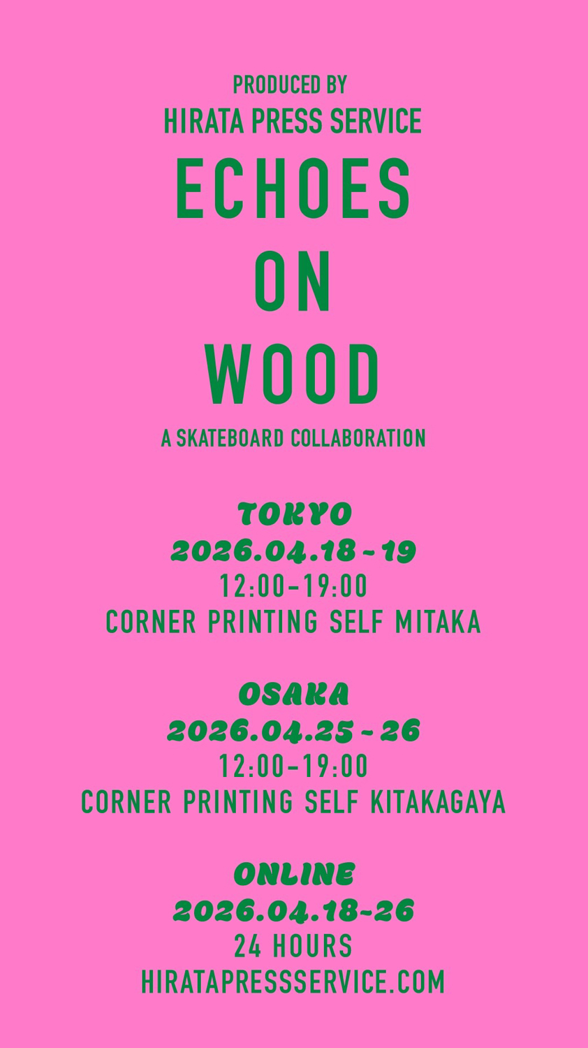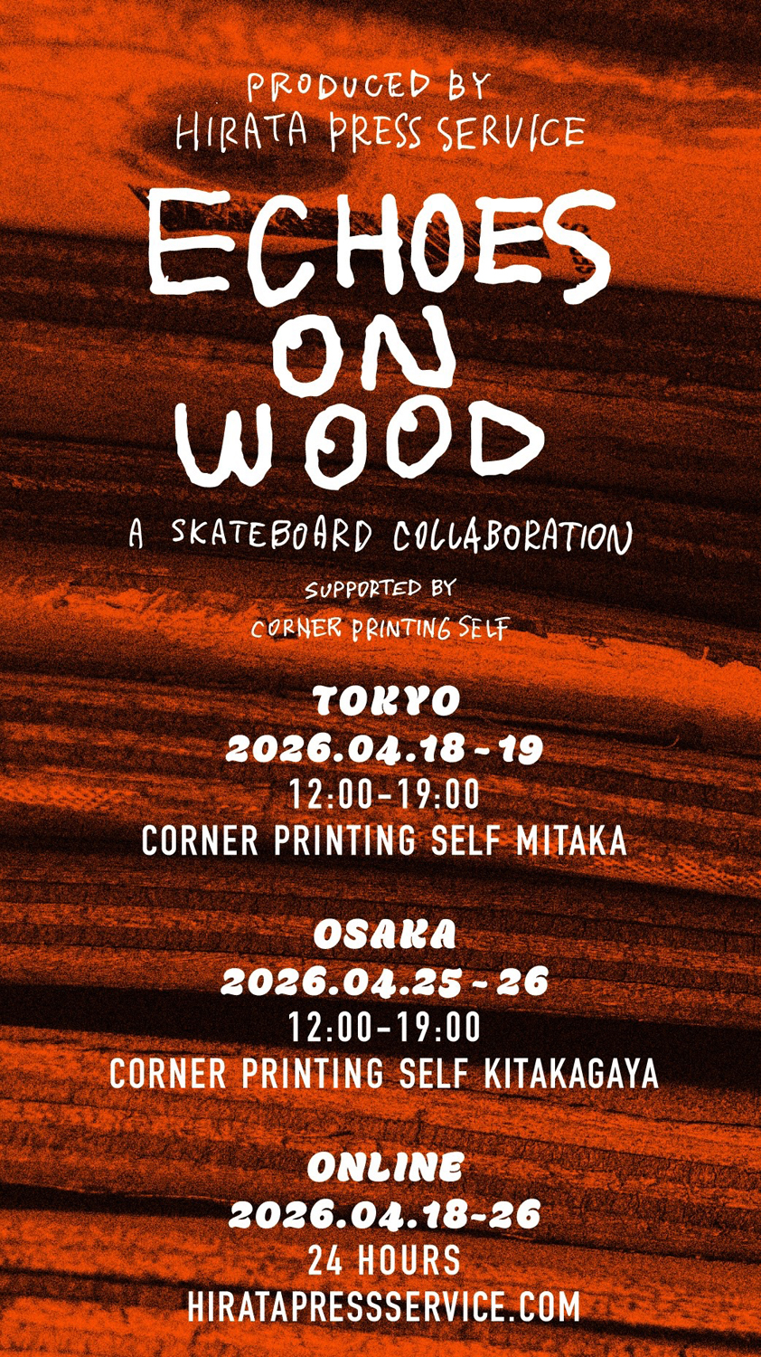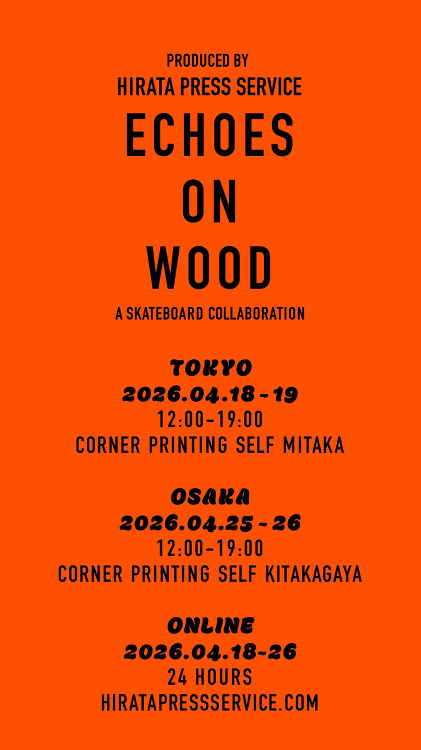 オリジナル・デザインのスケートボードを1枚から制作できるサービスを2025年より開始した「HIRATA PRESS SERVICE」(代表・平田佑介)が、7名の作家と共に制作したスケートボードの展示会「ECHOES ON WOOD」を4月18日(土) / 19日(日)に東京・三鷹 CORNER PRINTING SELF 三鷹店、4月25日(土) / 26日(日)には大阪・北加賀屋 CORNER PRINTING SELF 北加賀屋店にて開催。