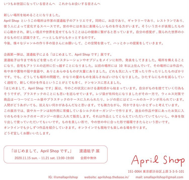 昨年7月に東京・恵比寿 nidi galleryより“ブラウスのレシピ本”『HOMEMADE BLOUSES』を刊行し、同地で「HOMEMADE BLOUSES 出版記念展」を開催した作家・渡邉紘子(Hiroko Watanabe)が、11月15日(日)に自身で運営するギャラリー / ショップ「April Shop」を東京・代々木上原にオープン。同日から渡邉の作品を展示販売する「はじめまして、April Shopです」を11月21日(土)まで開催します(会期中無休)。
