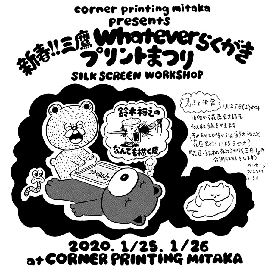 neco眠る諸作のアートワークで知られ、昨年は東京・恵比寿 KATAで開催されたMegu(Negicco)主催の展示販売企画「CURRY RICE RECORDS presents 30 Designer’s TEE-SHIRTS market!!!」への参加も話題となった大阪在住のイラストレイター・鈴木裕之が、東京・三鷹のセルフ・プリンティング・スタジオ「CORNER PRINTING MITAKA」でのシルクスクリーン・ワークショップ「新春!! 三鷹whateverらくがきプリントまつり」を1月25日(土)・26日(月)の2日に亘って開催。