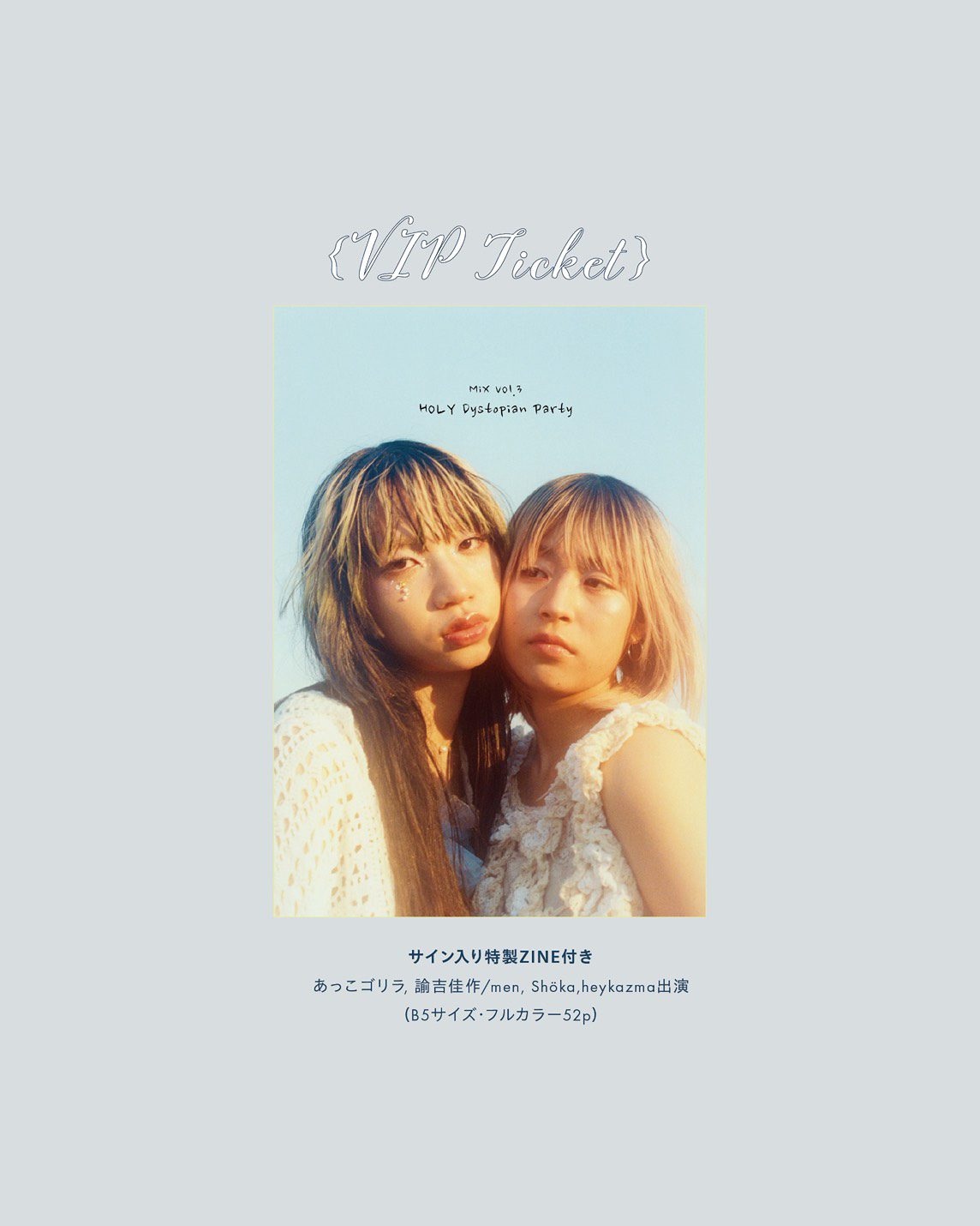 同イベントには、『MiX Vol.3 HOLY Dystopian Party』に参加したあっこゴリラ、heykazma、Shöka、諭吉佳作/menに加え、Bothisが出演。VIPチケットには、ジン参加出演者のサインが入った『MiX Vol.3 HOLY Dystopian Party』が付属します。