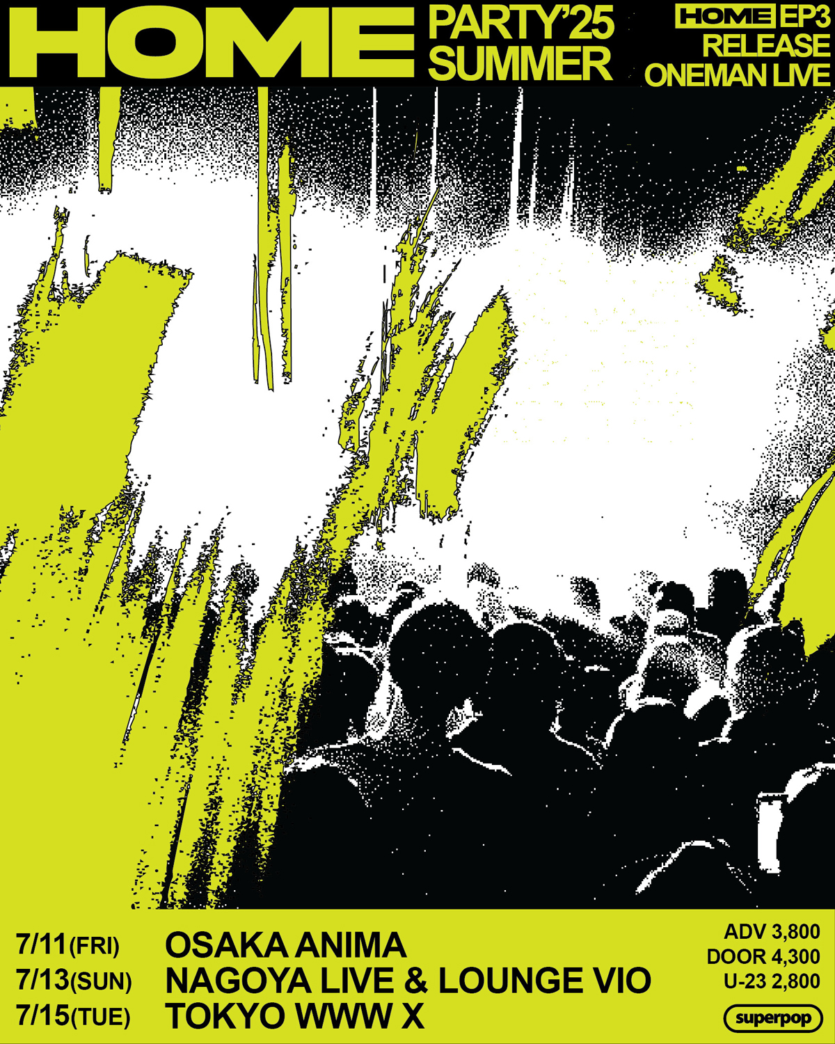 なお、これまでライヴ会場およびオフィシャル・ストア「HomeMade」のみでの取扱となっていた『HOME EP』『HOME EP2』『HOME EP3』フィジカル・エディションは、7月2日(水)より全国流通を開始。流通盤には特典としてステッカーが付属します。同月には単独ツアー「HOME PARTY'25 SUMMER -HOME EP3 RELEASE ONEMAN LIVE-」も開催。7月11日(金)大阪・心斎橋 Live House Anima、13日(日)愛知・名古屋 Live & Lounge Vio、15日(火)東京・渋谷 WWW Xの3公演は決定しています。