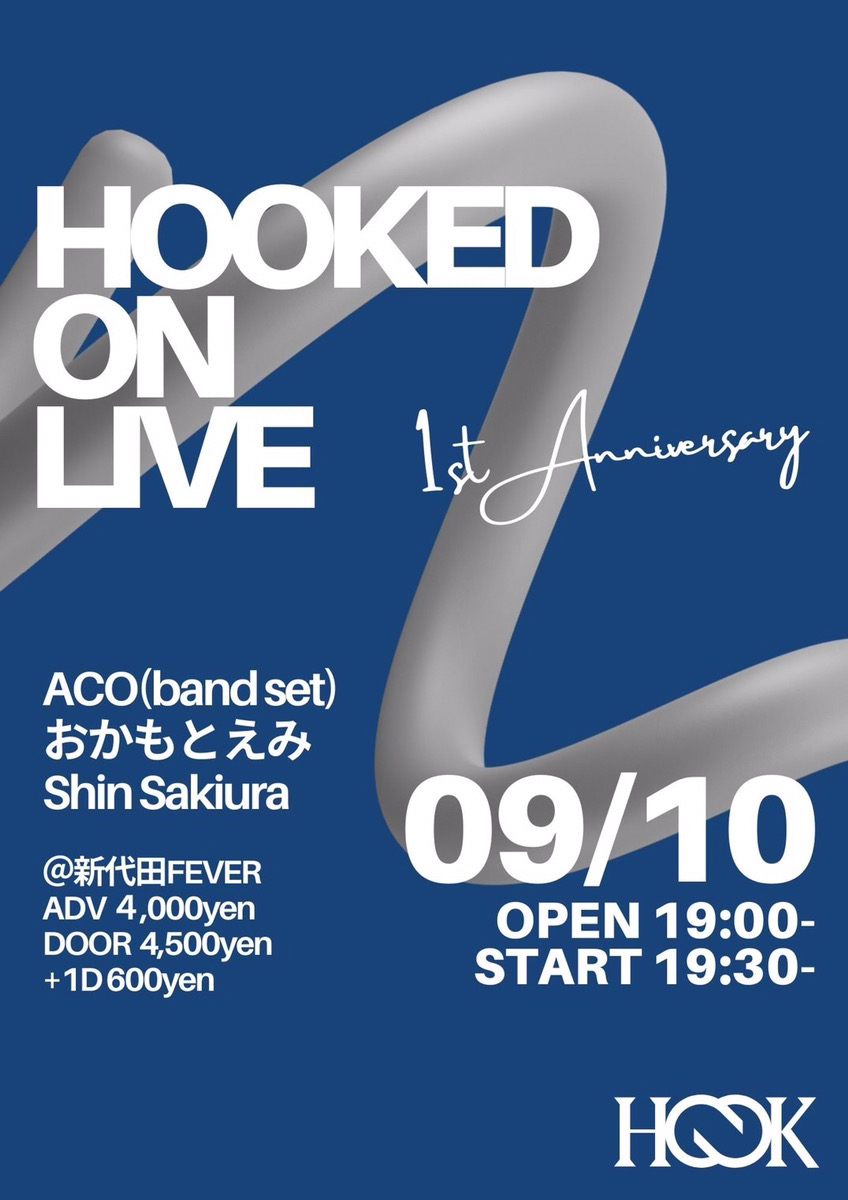 同公演は、4月にHOOK店内で催されたライヴ・イベント「HOOKED ON LIVE」のアニヴァーサリー・エディション。近年はアクセサリー作家としてブランド / ショップ「himitsu works」の運営でも活躍し、昨年は目下最新シングル『YOU GOT IT』が好評を博したACO、フレンズの一員としても知られ、昨年のシングル『sweet moratorium』がTVドラマ「スイートモラトリアム」(TBS系)のOPテーマに起用されて話題となったおかもとえみ、bane、Furui Riho、Maika Loubté、さらさ、Wez Atlas参加の4thフル・アルバム『Inner Division』を昨年6月に発表したShin Sakiuraの3組が出演します。ACOは中尾憲太郎(b | 勃殺戒洞, Crypt City, NUMBER GIRL)、柏倉隆史(dr | toe, the HIATUS)、中村圭作(key | toe)とのバンド・セットでのパフォーマンスを予定。