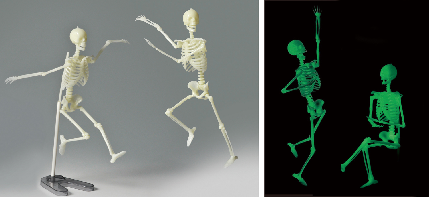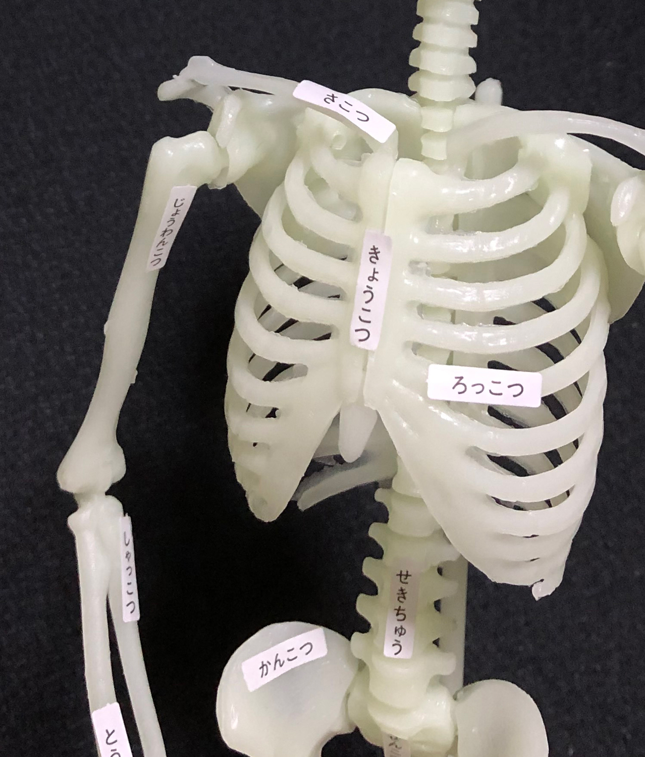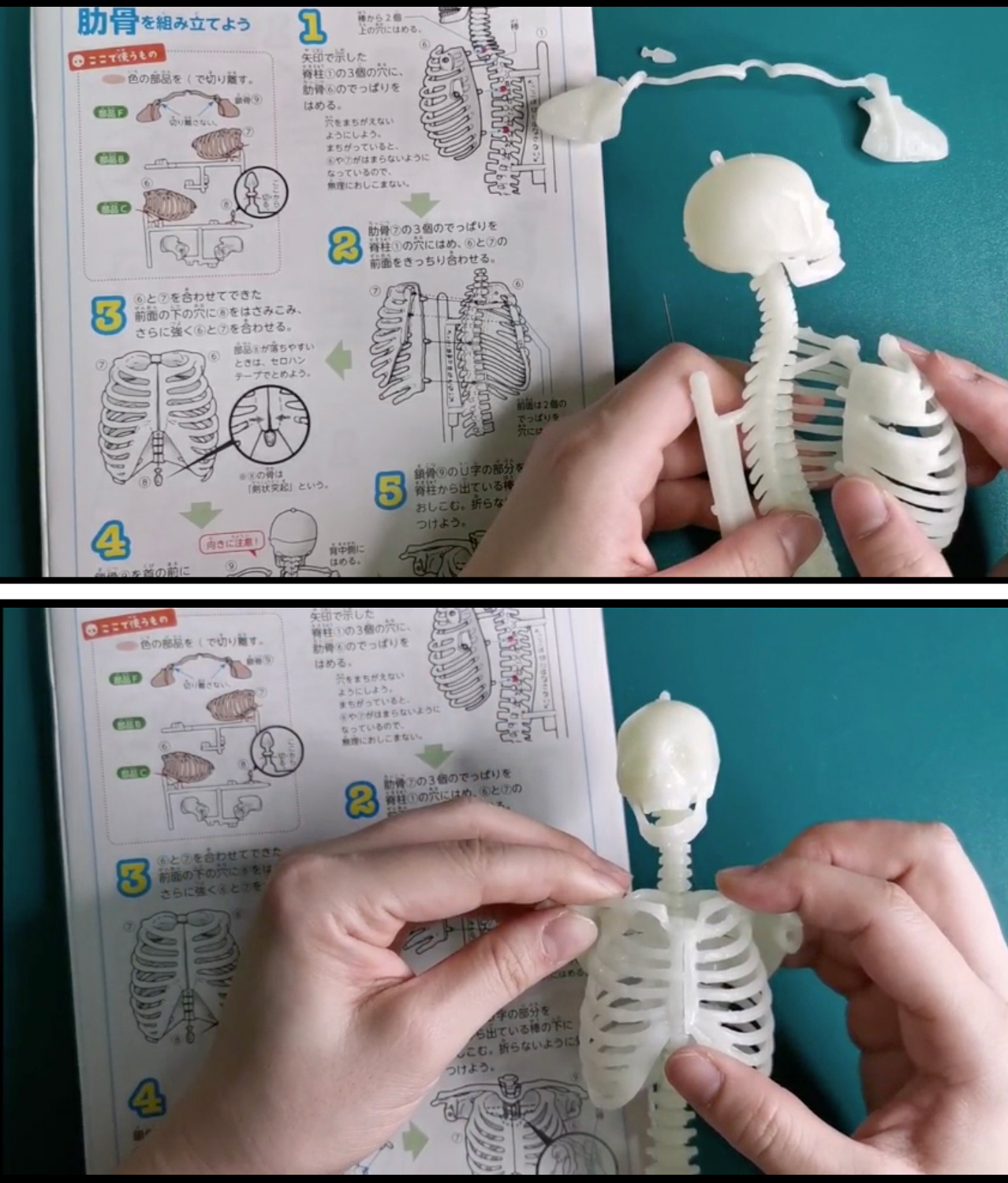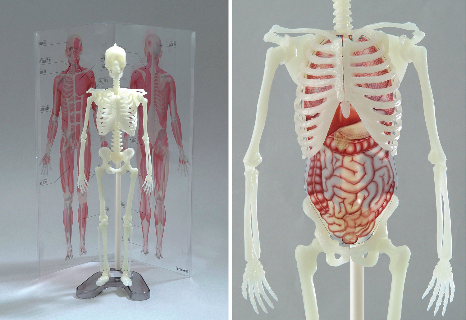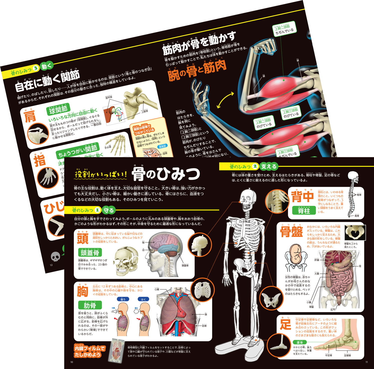 同書は、成人の約1/6スケールの人体骨格模型キットと24ページのガイドブックで構成。骨格模型は、多彩なポージングを可能にする設計、蓄光素材など、従来の特徴を引き継ぎつつ、全身の主要な筋肉を同スケールでプリントした「筋肉パネル」、骨格模型にジャストサイズの「内臓フィルム」、2種(平仮名 / 漢字)の「骨の名前シール」「内臓の名前シール」をリニューアルにあたって同梱。ガイドブックは、骨格模型のアセンブルや遊びかた、骨および筋肉の仕組みをオールカラーで詳しく解説しています。