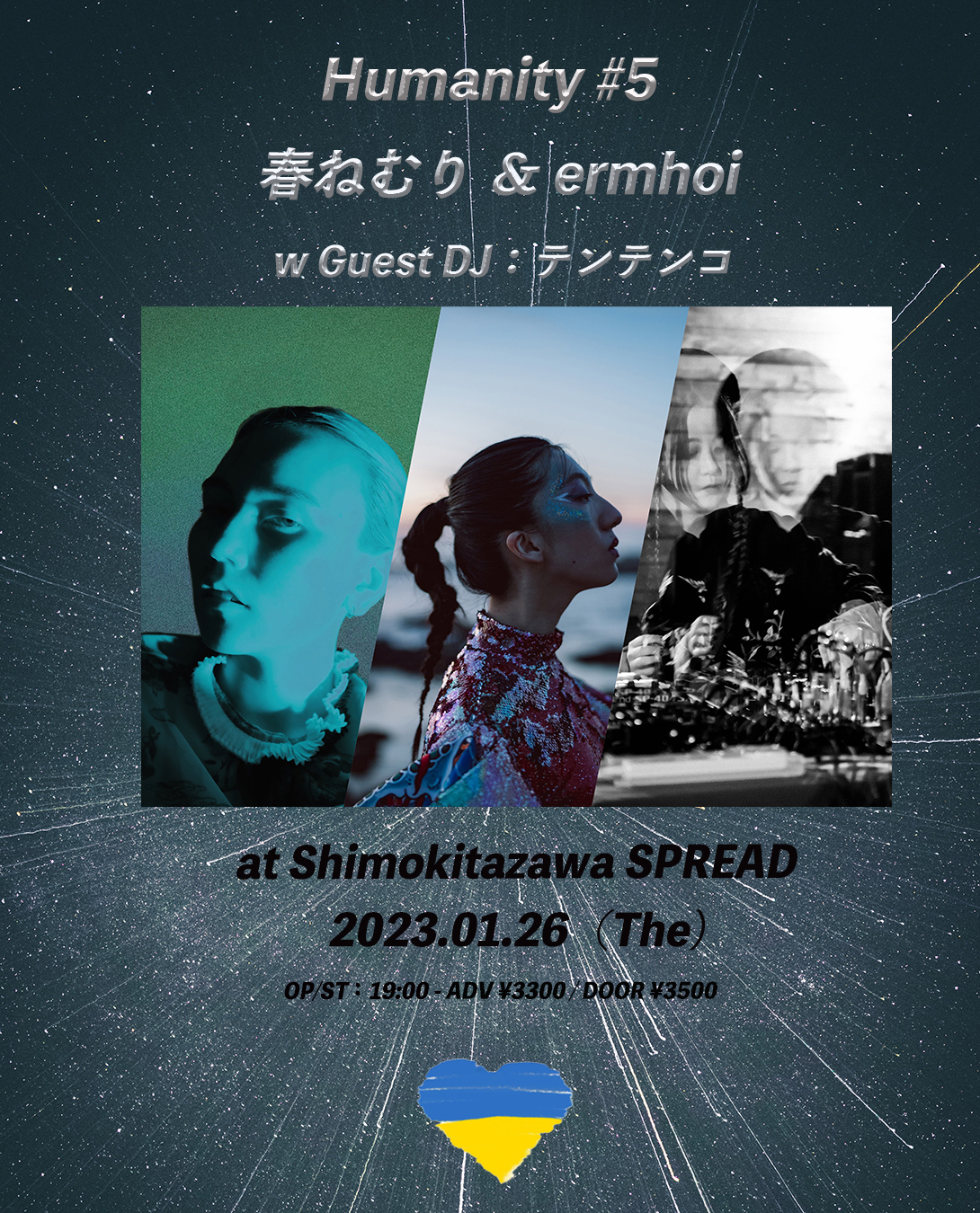 12月8日にAndres Coco、aTTn、nasthug、OKBOY + Dogwoods、鯱、妖艶金魚を迎えて第4回が開催されたライヴ・イベント「Humanity」の第5回が、東京・下北沢 SPREADにて2023年2月15日(水)に開催されます。同公演にはermhoi、春ねむりが出演し、両者ロングセットでの2マン・ライヴを予定。ゲストDJとしてテンテンコの出演も決定しています。