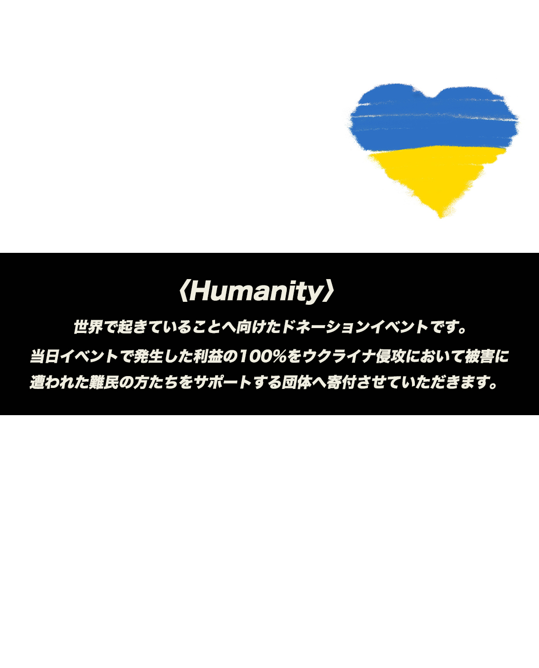 「to'morrow music / to'morrow records」が主催する「Humanity」は、ウクライナ難民へのドネーションを目的に継続するライヴ・シリーズ。イベントの利益は、各国で難民支援活動を行う「国際救済委員会(International Rescue Committee)」を通じて全額が寄付に充てられます。