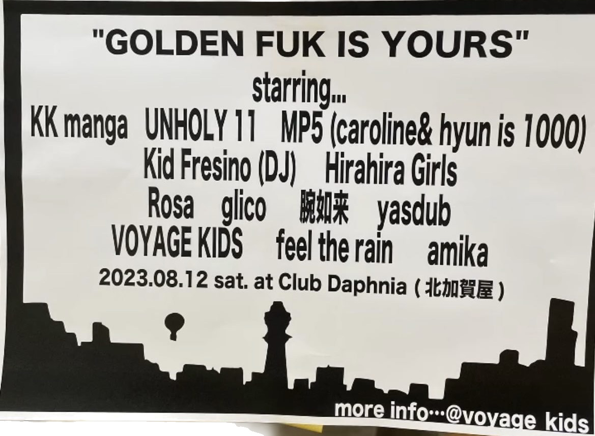amika / feel the rain / glico / Hirahira Girls / Kid Fresino (DJ) / KK manga / MP5 (caroline & hyunis1000) / Rosa / 腕如来 / UNHOLY 11 / VOYAGE KIDS / yasdub