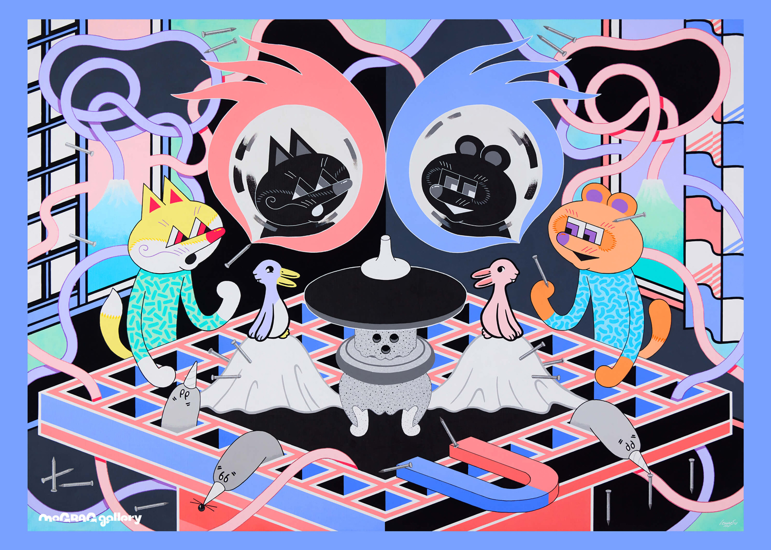 同展では、新作のアクリル絵画作品を展示販売。シルクスクリーン・ポスターやTシャツなどのアイテムも用意されています。初日の18:00からはオープニング・パーティも開催。