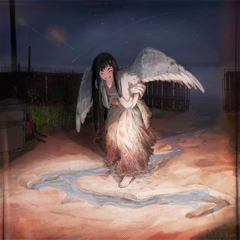 r 「もともとは、Twitterでフォローされたのか、フォロー返したのかわからないんですけど、前は全員フォロー返してたんで。それで、夜中かな、仲間さんがつぶやいてて。“俺、絵描くの辛い”みたいな。プロフィール見たら、絵、クソうまくて。だからリプライで“めっちゃすごいすね”みたいな。そこから仲良くなった感じです。『週刊少年ジャンプ』に描いたりしている漫画をちょくちょく読んでいて、表現すごいなって。アートワークは、DM送ってOKもらって描いてもらったすね。自分が想像したより数十倍も良いアートワークが来て。天使を描いてくださいってお願いした天使が、怪我してたり、汚れてるけど、笑ってて。めっちゃくちゃ良いなって。すっごい気に入ってるんすよね。本人にも言ったんすけど、人生の道標になりそう、みたいな」