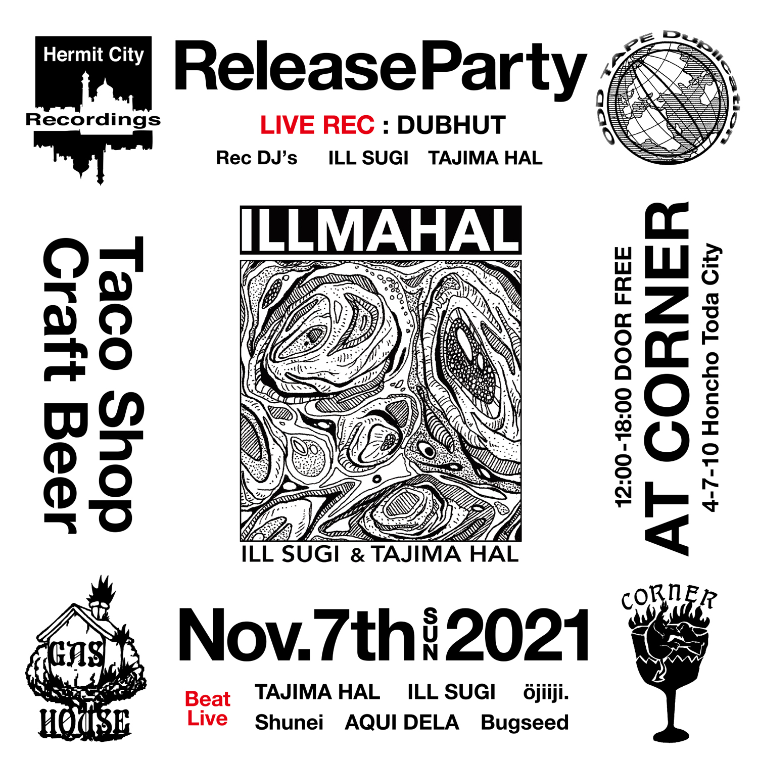 同公演は、『ILLMAHAL』のリリース元であるtajima hal主宰レーベル「Hermit City Recordings」と、プリンティング・カンパニー「CORNER PRINTING」のカセットテープ制作部門「ODD TAPE DUPLICATION」による共同で開催されるもの。ILL SUGIとtajima halに加えてaqui dela、Bugseed、öjiiji.、Shuneiによるビート・パフォーマンスも予定されているほか、噂のタコ・ショップ「GASHOUSE2.5C」もフード出店。なお当日は、ODD TAPE DUPLICATIONによるダビング・エリア「DUBHUT」がILL SUGI + tajima halのスピンをリアルタイム録音。現場でデュプリケートしたカセットテープが数量限定で販売されます。