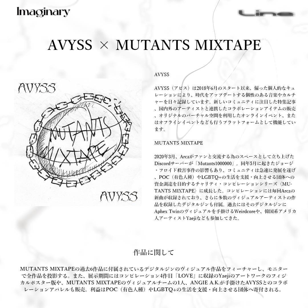 また、会期中AVYSSのスペースでは、ANGiE A.K.がデザインしたAVYSS x MUTANTS MIXTAPEのコラボレート・アイテム2種(Tシャツ 3,500円 | フーディ 5,500円)を販売。利益は「MUTANTS MIXTAPE」の理念同様、POC / LGBTQ+支援団体への寄付に充てられます。