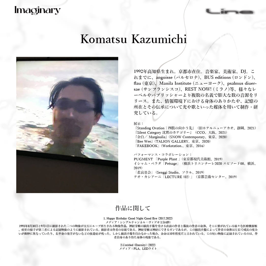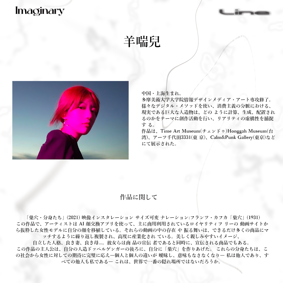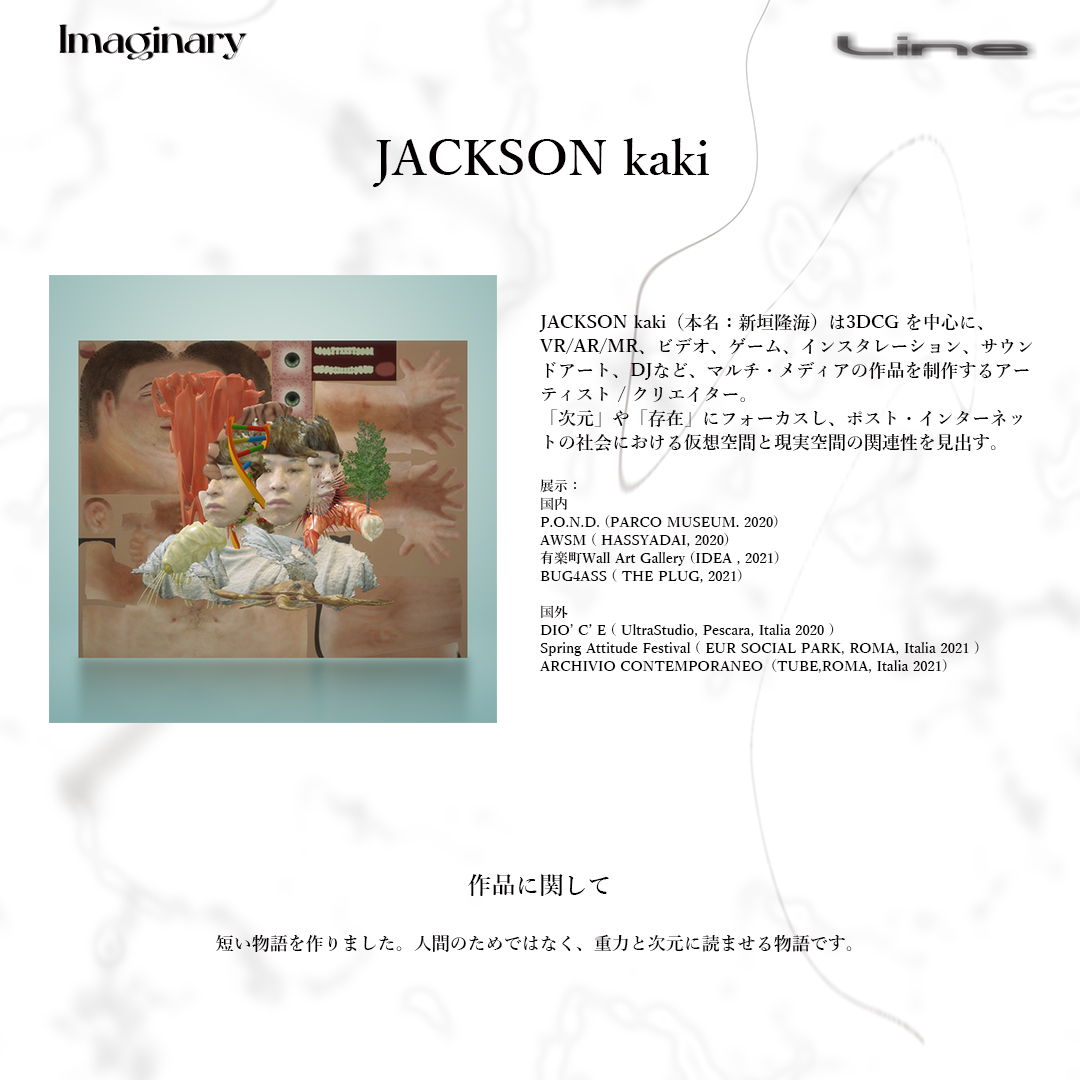 JACKSON kakiのキュレートにより、1月31日(月)から2月4日(金)まで平日デイタイムの東京・渋谷 Contact Tokyo全フロアにて開催されるグループ・エキシビション「Imaginary Line」。封切りに先駆け、各出展作家のキャプションボードが公開されています。