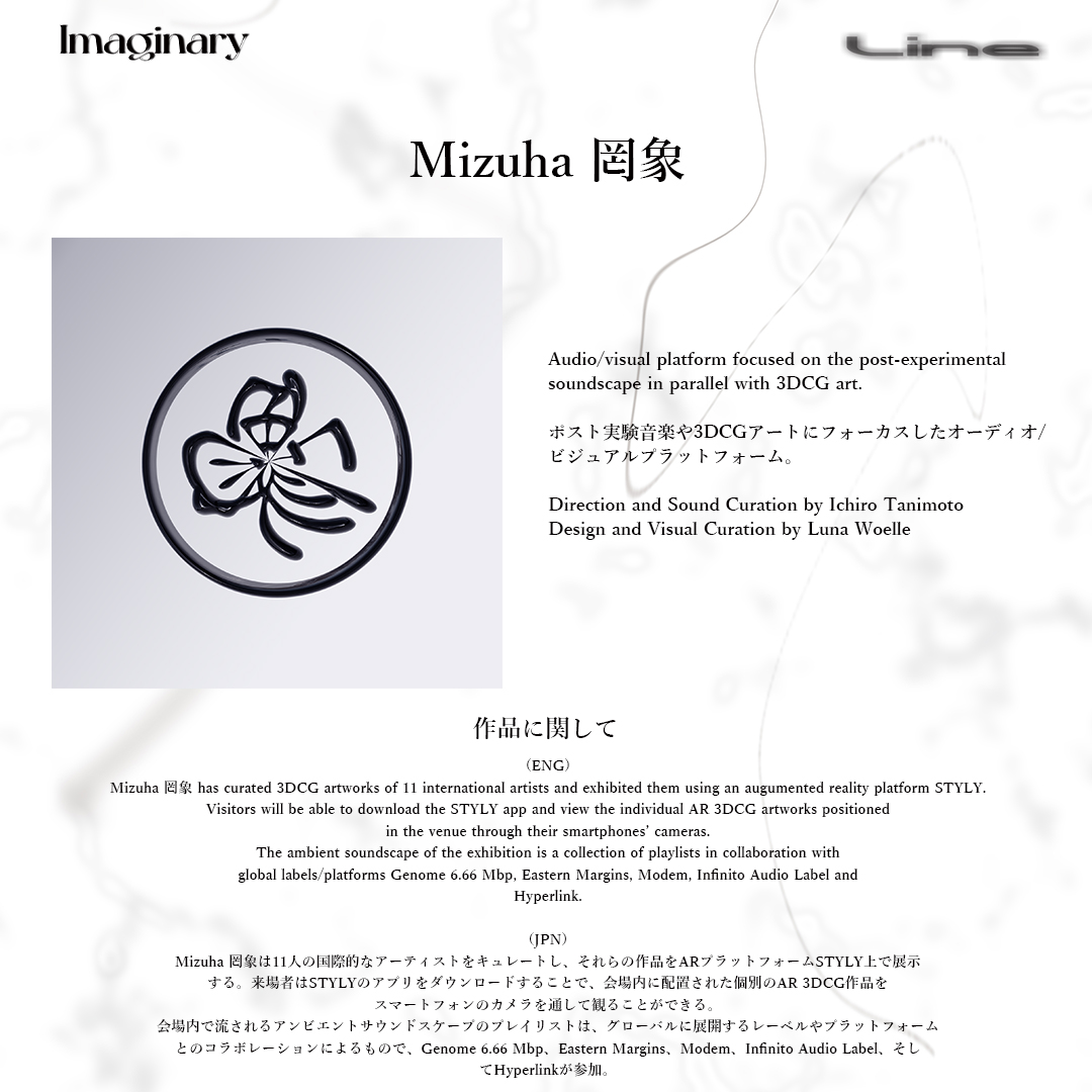 「Eastern Margins」「Genome 6.66 Mbpn」「Infinito Audio Label」「Modem」「Hyperlink」の5レーベルとコラボレートしたアンビエント・プレイリストが再生される「Mizuha 罔象」のスペースには、Nicolò Cervello、DIGITONICA、Pacôme Le Rouge、LINML、Nefo + Brainmom b.2000、Felix Neuman、Christian Schwarz、Eugen Sinitsyn、CATTIN TSAI、v3loが出展。いずれもARでの鑑賞が可能となっています。