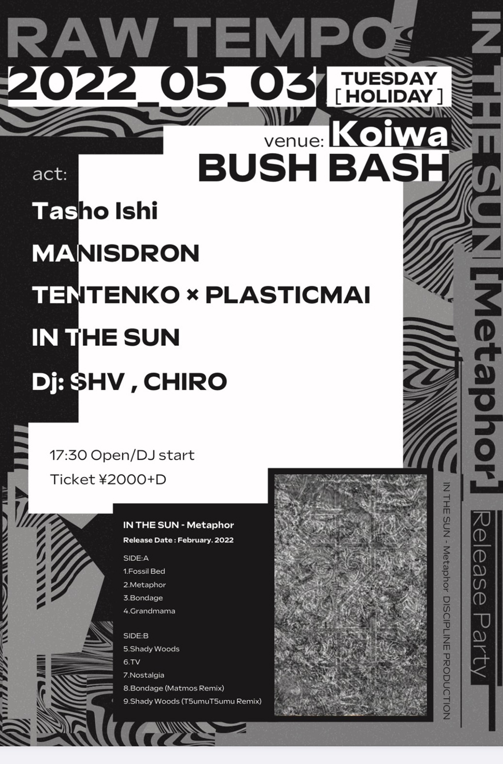 S 「あと5月3日(水・祝)に『Metaphor』のリリース・パーティ小岩編をBUSHBASHで、7月23日(土)深夜に延期になっていたリリース・パーティ下北沢編のリヴェンジをSPREADでやります。BUSHBASHのほうはでライヴアクトを中心としたデイ・イベント、SPREADのほうはナイトの時間帯でワールドだったりトライバルな質感のある電子音楽のパーティの中にIN THE SUNを組み込むという趣旨で組みました。どちらも違った素晴らしい体験ができると思うのでぜひ両方足を運んでいただけると嬉しいです!」