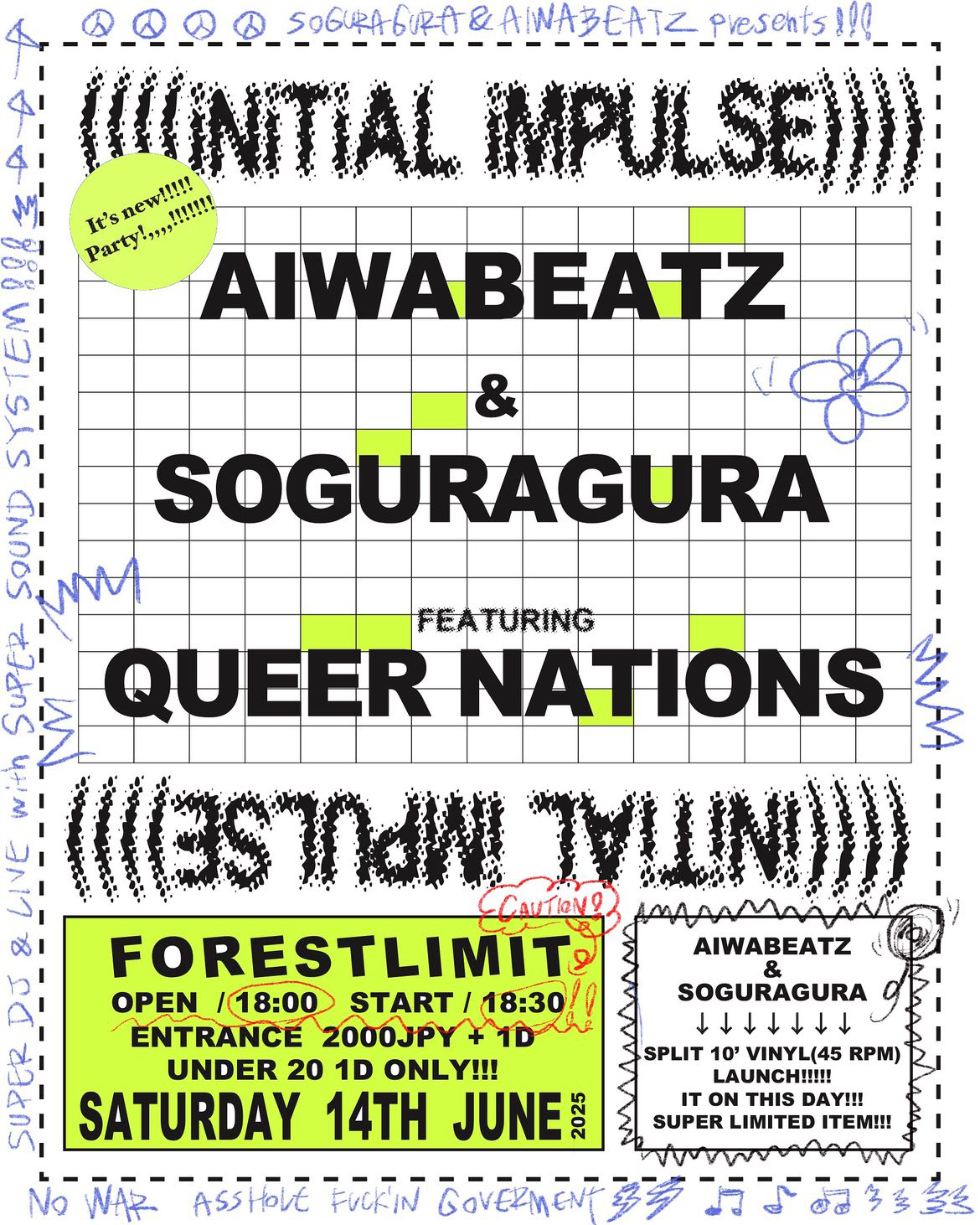 スクリューの手法を拡張する表現で知られるDJとしてのみならずプロデューサーとしても活躍し、近年はYuki TAMANO(UNCIVILIZED GIRLS MEMORY, ZENOCIDE)と組んだ6LVCK H3RXNでの活動も注目を浴びるAIWABEATZと、東京・高円寺 GRASSROOTSでのパーティ「¡¡guragura!!」を主催し、もはやアートピースと言って差し支えないであろうパッケージの限定ダブプレートも話題となっているDJ・soguraguraが、共同で新規パーティ「iNiTiAL iMPULSE」をスタート。初回が6月14日(土)に東京・幡ヶ谷 Forestlimitにて開催されます。