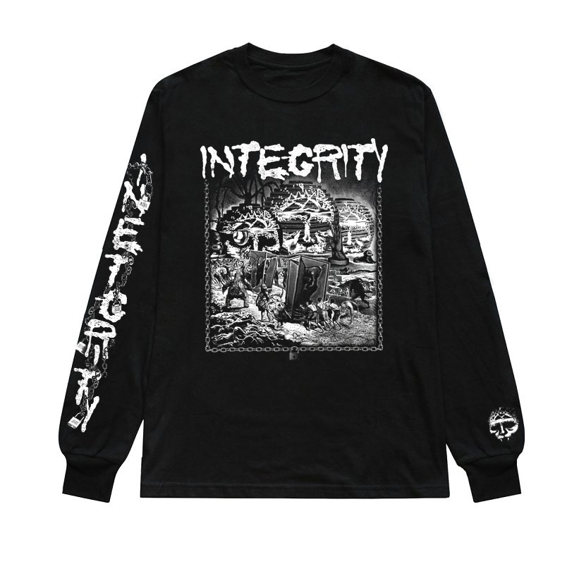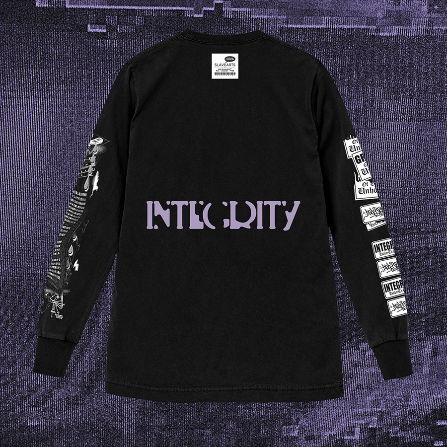 2017年に敢行した目下最新アルバム『Howling, For The Nightmare Shall Consume』(Relapse Records, 2017)を携えてのジャパン・ツアーが好評を博し、かつての“INTEG2000”名義を想起させるDonna Summerカヴァー入りシングル『I.N.T.E.G.2K.18』や、「Magic Bullet Records」ファウンダーBrent Eyestone率いるBLEACH EVERYTHINGとのスプリット・アルバム、Dwid Hellion師自身によるパワーエレクトロニクス・プロジェクトPsywarfareとのカップリング・シングルなど近年も話題作の続くHoly Terrorハードコア大帝INTEGRITY。そのオフィシャル・マーチを、ディレクター・那倉太一(ENDON) aka L💔💲💲とデザイナー・玉野勇希(UNCIVILIZED GIRLS MEMORY, ZENOCIDE)を中心に設立され、昨年ニック・ランド認定「サイバネティック文化研究ユニット」アイテムや『serial experiments lain』アイテムで注目を浴びたアパレル・ブランド「SLAVEARTS®︎」が制作。コラボレート・アイテム2種が販売されます。