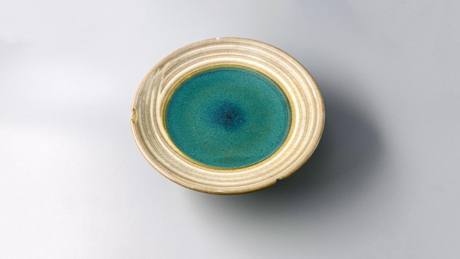 中心部分が丸く浅葱色に染め分けてあり、釉薬が溜まった部分にかけて色が濃くなるグラデーションになっています。リムはありませんが、縁をぐるりと囲むように白色の刷毛目模様が入っていて目にもおもしろく、なんとなくただ眺めていても見飽きません。ぽってりと厚めのフォルムは、扱いに気を使わなくてもいいから安心……と思っていたら、いつの間にか1ヶ所、2ヶ所……と、縁が欠けてしまいました。主な役目はおかずの取り分け皿。リムがない分、縁のぎりぎりいっぱいまで料理を載せられますし、刷毛目模様のおかげで、真ん中にちょっとだけ載せたおかずもオンステージのように堂々として見えます。また、ケーキにクッキー、大福、たい焼きなど、お菓子であっても洋の東西を問わず受け止めてくれるので、縁が欠けてしまったもののスタメンからどうしても外せず、引き続き登板し続けてもらっています。