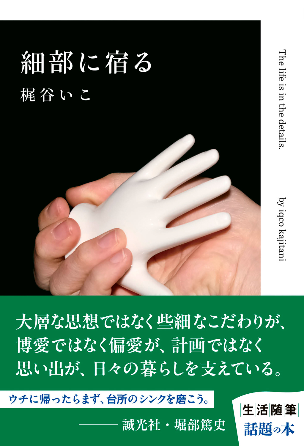 日常の“細部”にまつわるエッセイ19編を収めた『細部に宿る』は、前半11編をほぼ書き下ろし、後半は「梶谷いこのホームページ」に掲載されている「当用雑記」や新たな書き下ろしも含む8編のエッセイに加えて、兵庫・神戸の書店「1003」の店主・奥村千織による解説を掲載。カヴァー・フォトは鳥取の古道具店「がふ」が撮影。帯文は京都の書店「誠光社」の店主・堀部篤史が寄せています。