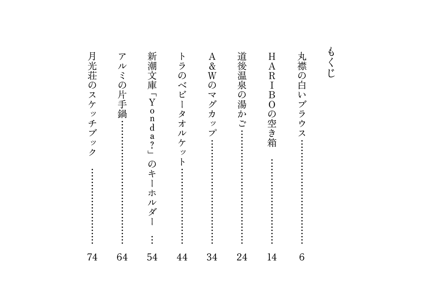 丸襟の白いブラウス / HARIBOの空き箱 / 道後温泉の湯かご / A&Wのマグカップ / トラのベビータオルケット / 新潮文庫 「Yonda?」のキーホルダー / アルミの片手鍋 / 月光荘のスケッチブック