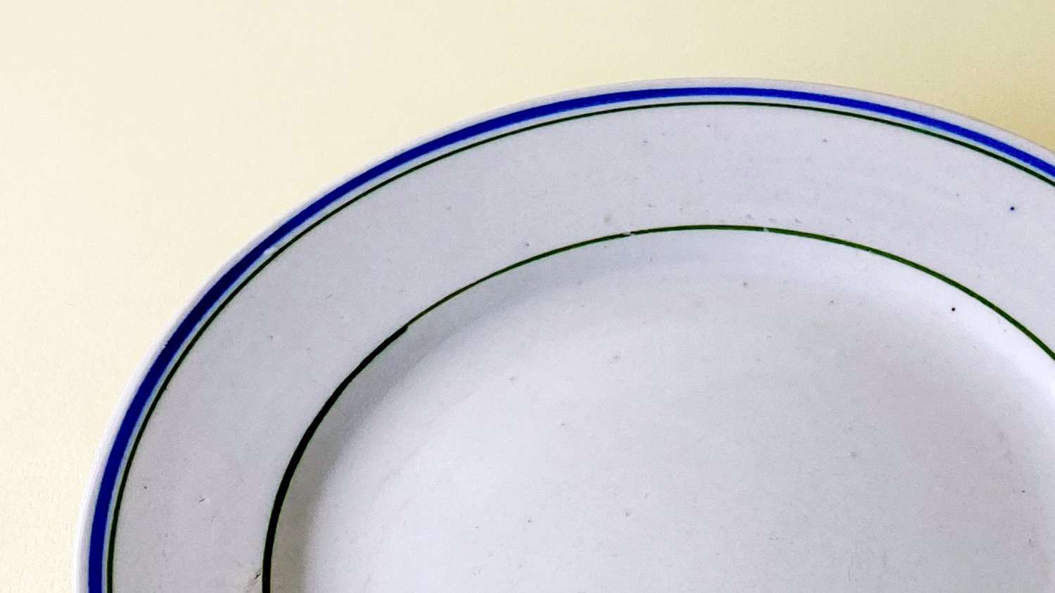 青と緑のラインが爽やかな印象の白いリム皿。グレーがかった白色に濃い抹茶色とロイヤルブルーのラインがよく映えます。爽やかな雰囲気の中にシックな趣もあって、一筋縄ではいかない良さに惹かれて雑貨店にて購入しました。