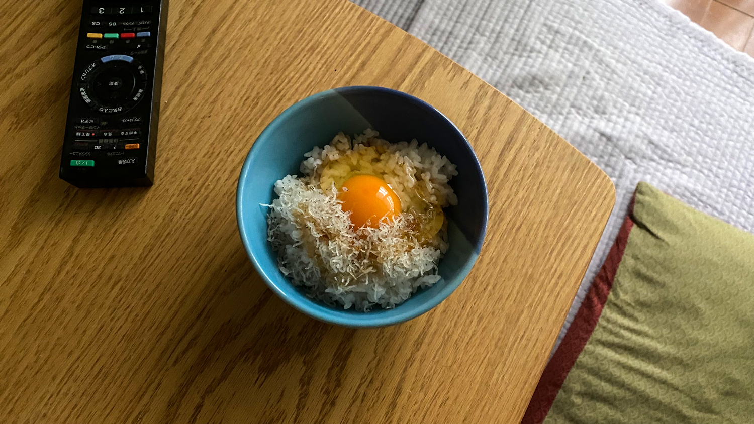 丼メニューではありませんが、近年で最も活躍するのは“おじゃこ卵かけごはん”を食べるときです。“おじゃこ卵かけごはん”は休日で遅く起きた朝(ほぼ昼)の定番メニュー。チンした冷凍ごはんに生卵を割り落とし、上にちりめんじゃこをこんもりと載せます。それから醤油をたらりとまわりかけ、ぐずぐずにかき混ぜて掻き込むようにして食べるのです。これでタンパク質、鉄分、そしてエネルギーのチャージが完了!いつも使うめし茶碗ではかき混ぜるには大きさが足りず、このどんぶり鉢に登場を請うというわけです。青系統のカラーリングに生卵の黄色がよく映えるのもポイント。補色関係のパッキリした色合いに、ただの卵かけごはんが急に80~90年代のトレンディ感を醸し出してきて、気分がパッと明るくなります。