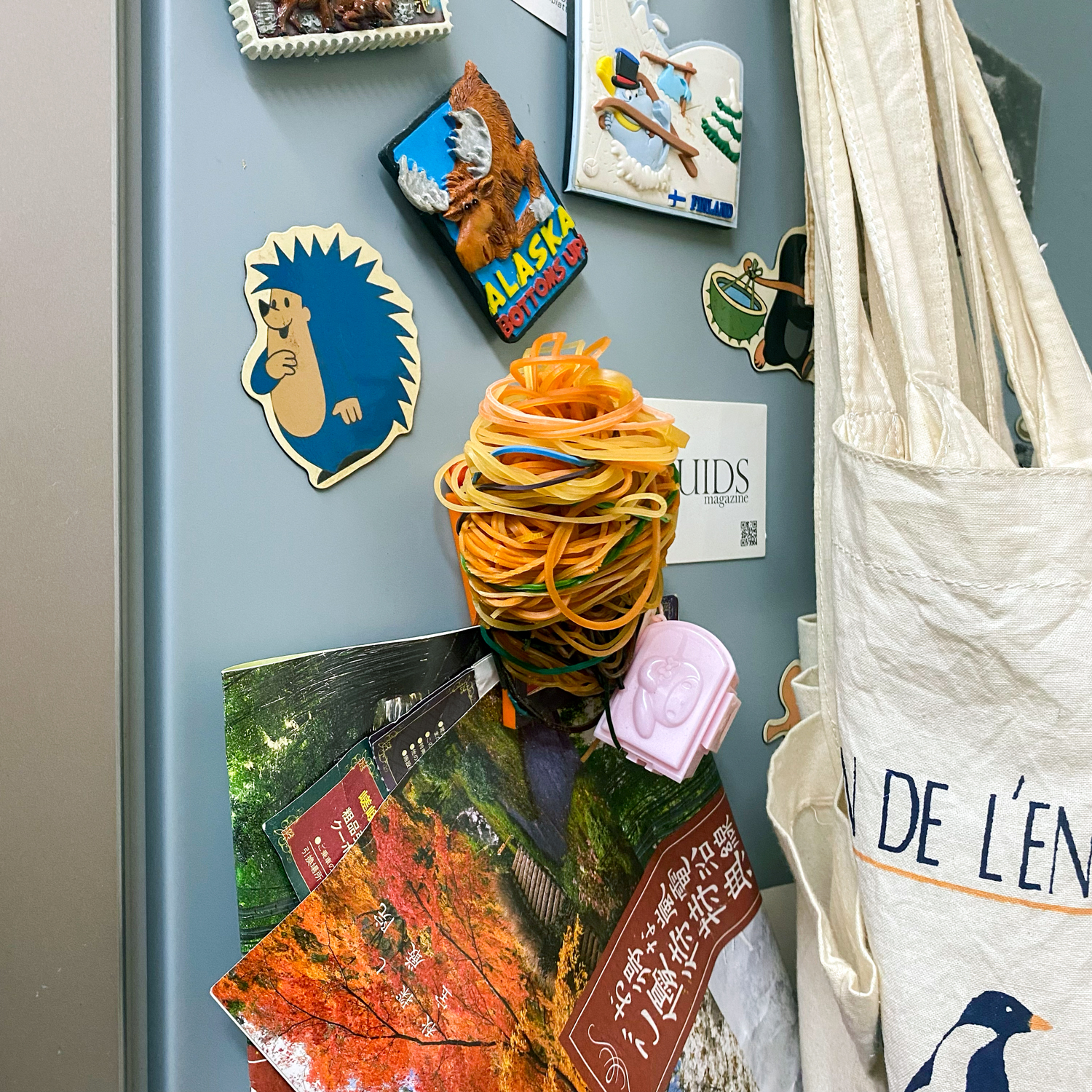 以来、それに従って、スーパーの惣菜のパックにかけられたものでも、荷物を束ねてあったものでも、輪ゴムとくれば何も考えずそこにかけていった。サンリオショップでノベルティにもらったマイメロディの小物入れも、良い使いかたが見つからずとりあえずそこにかけてみた。そうして5年経ち、10年経ち、輪ゴムは母が持たせてくれた最初の10個を芯にしてだんだんと増え、今ではそれが地層のように折り重なって、一見するとパスタの束のような姿になってしまった。