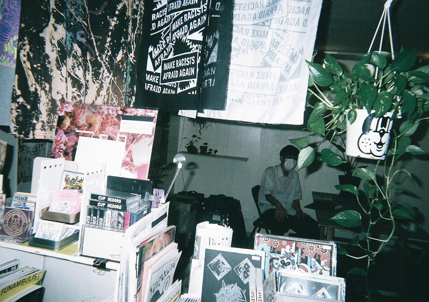 「もともとパンクのジンを作ったり、世界各地のDIYパンクのレコードとかジンを取り扱うディストロをやっていて、ライヴで出店したり、自分で作ったジンを、ライヴハウスで配ったり売ったりしていました。その頃に知り合った人が、ここで会社をやっていたんですよ。その人に、ここのスペースの半分を使って、何かできないかな?って言われて。それで、ディストロで扱ってたものを持ってきてスタートしたのが始まりです」