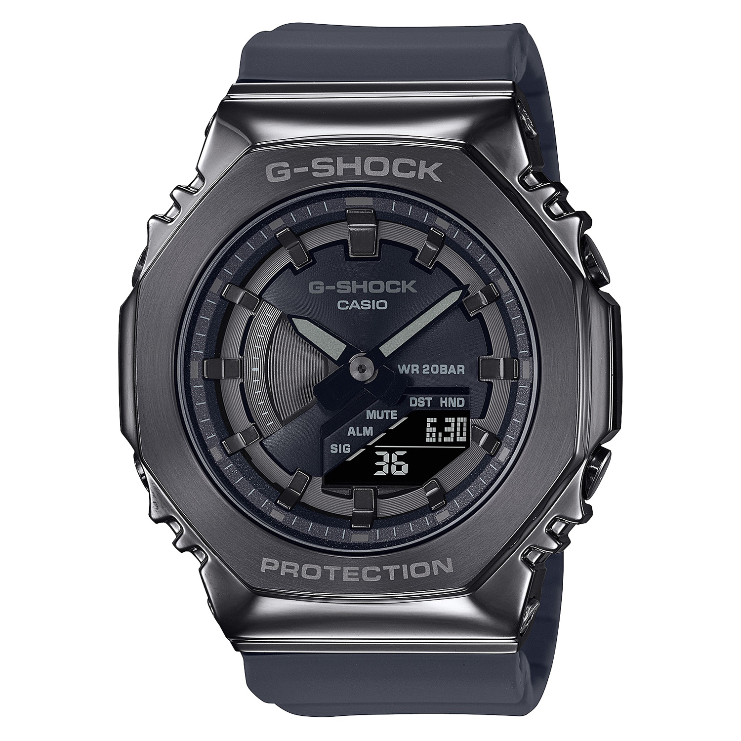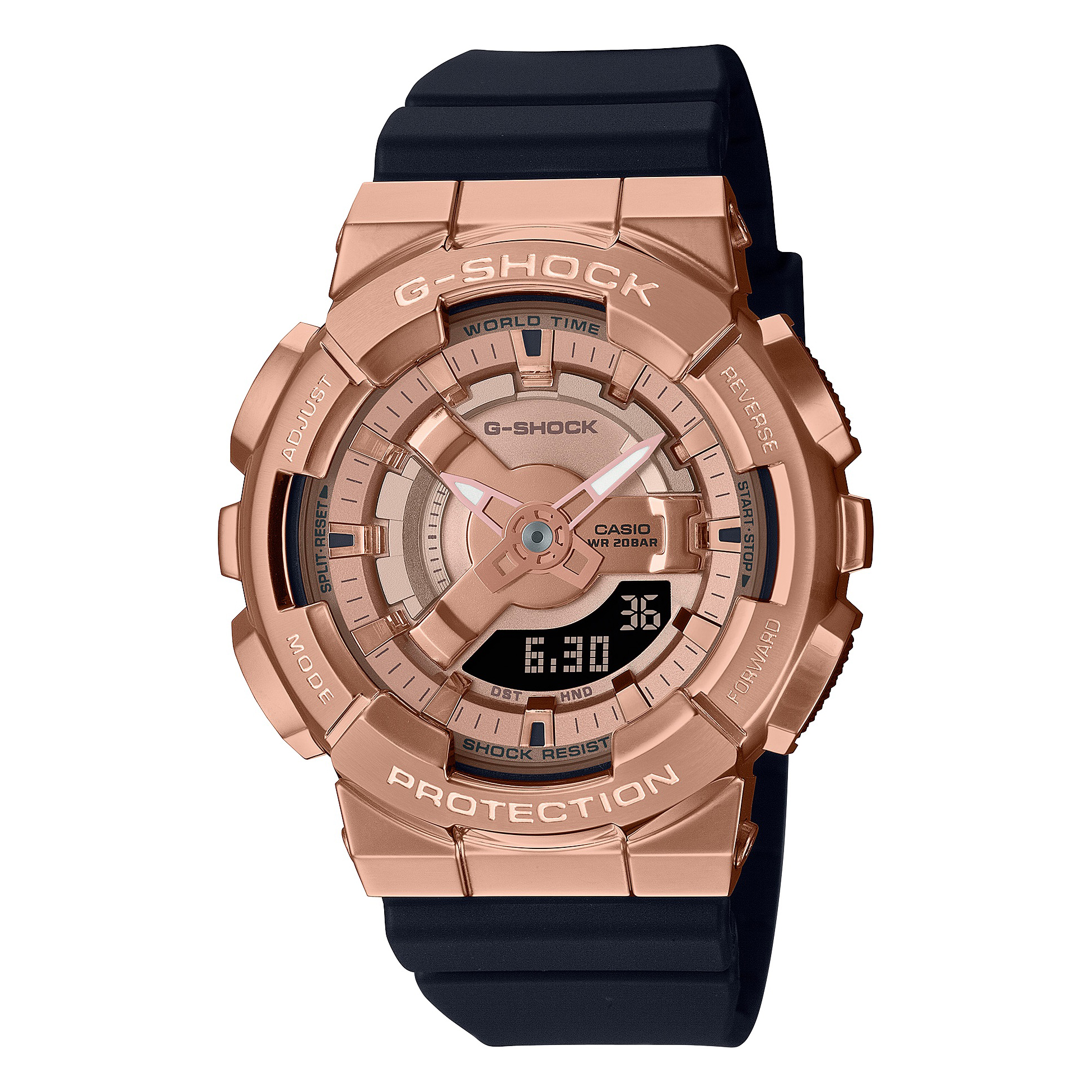 立体的な文字板が特徴のデジタル・アナログコンビネーションモデル「GA-110」をミドルサイズにした“G-SHOCK”です。複雑な形状のメタルベゼルはヘアラインとミラー加工で磨き分けを行い、メタルの質感を高めました。