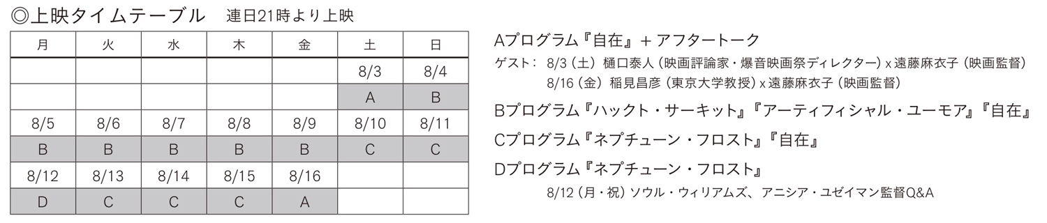 会期中の8月3日(土)には、遠藤とゲストの樋口泰人(映画評論家 | 爆音映画祭ディレクター)によるトーク、12日(月・祝)にはソウル・ウィリアムズ + アニシア・ユゼイマン監督との「Q & A」、16日(金)には遠藤とゲストの稲見によるトークも実施されます。