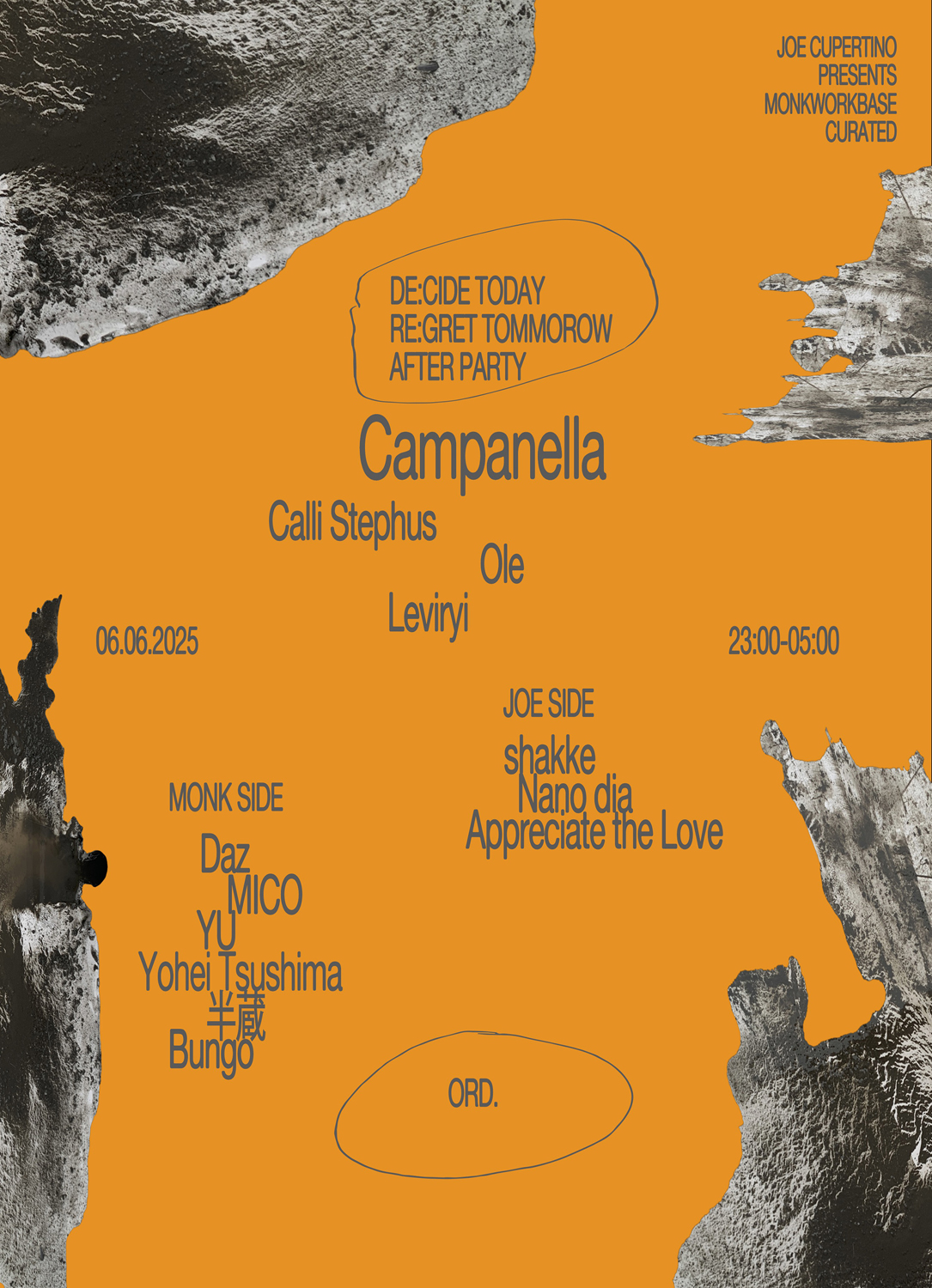 また終演後には、同会場にてアフター・パーティも開催。ゲストのCampanellaやCalli Stephus、Leviryi、Oleによるライヴ・パフォーマンスに加え、DJとしてJoe Cupertinoとの縁深い面々や、クリエイティヴ・クルー「MONK」が主催するイベント「MONKWORKBASE」のキュレーションによるラインナップも出演します。