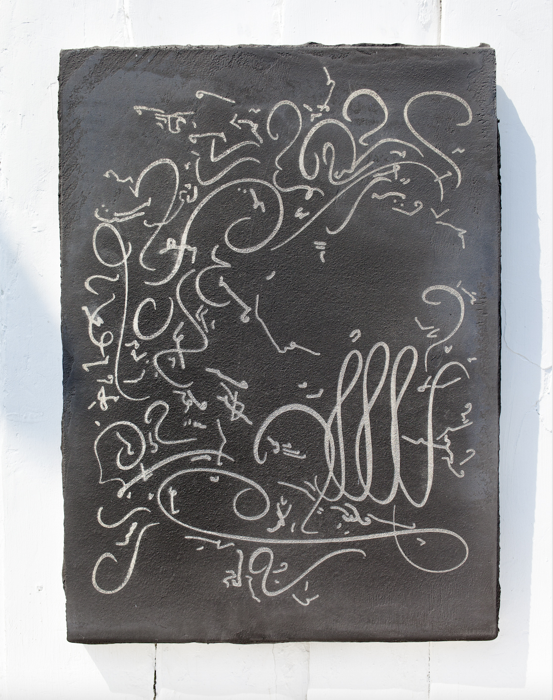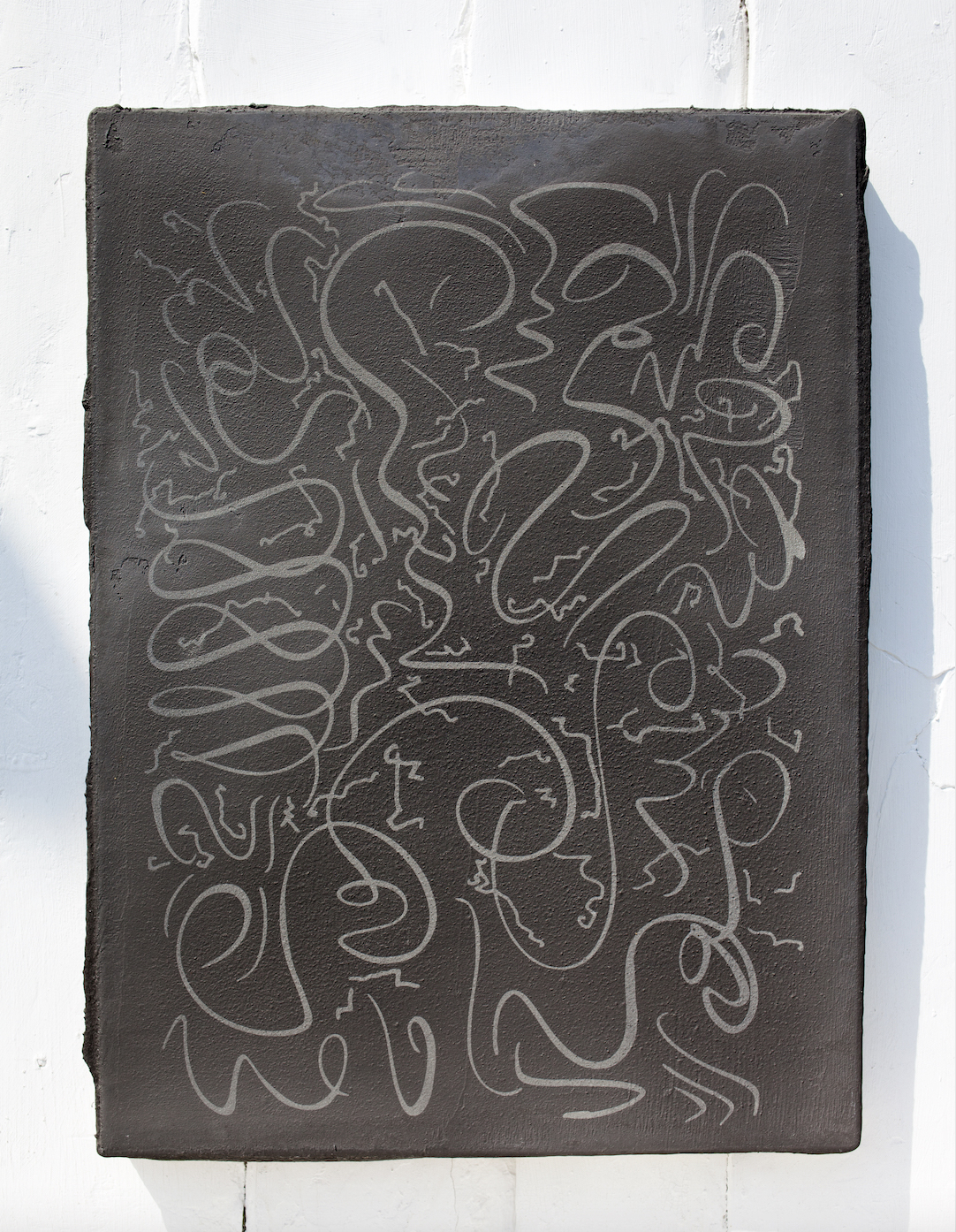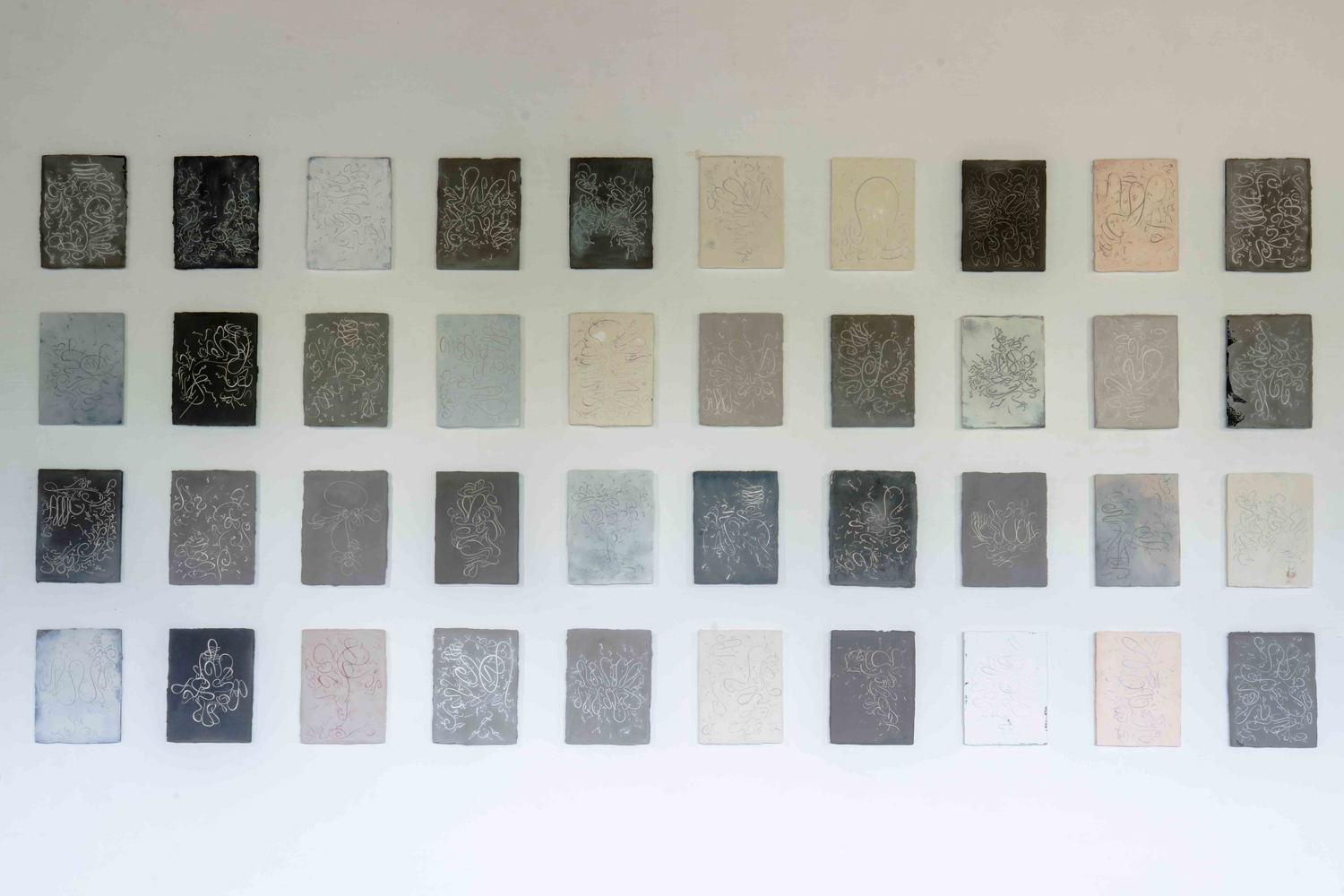 1990年代半ばより、ライフワークとして筆を使った線画のドローイングを続けてきました。絵を描く前の準備運動のように始めたものですが、最近になってこのドローイングと自分の今の作品とのつながりをより感じるようになりました。アメリカの実験音楽家ロバート・アシュリーの作品に「Automatic Writing」(1979年)という名盤がありますが、彼はここで言葉と電子音を初めて融合させたと言われています。自分の絵は音楽に影響を受けており、音を絵にすることは自分の一貫したテーマですが、本展ではこの曲のタイトルを引用し、絵画によって「Automatic Writing」を生成しようと試みました。事前に考えず、直感で自由に描く線画は自動書記の要素を元々持っていますが、今回は30年以上続けているこの線画をレーザーカッターを用いて漆喰に印字しています。それを40枚組で展示し、組作品の「Automatic Writing」として発表します。