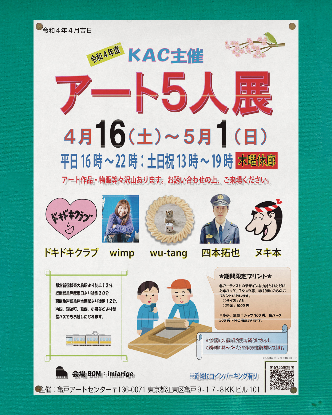 石部 巧と石部奈々美 aka chappyによるアート・デュオ「2blks」が運営する東京・亀戸のオルタネイティヴ・スペース「亀戸アートセンター」が、ドキドキクラブ、wimp、wu-tang、四本拓也、ヌキ本の5名が出展するグループ展「アート5人展」を4月16日(土)から5月1日(日)まで同地で開催。