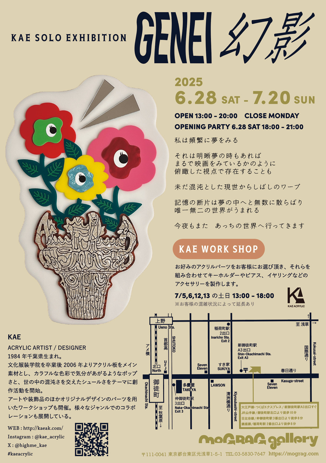 様々なブランド / ショップ / キャラクターとのコラボレート・アイテムや、オリジナル・パーツを使用したアクセサリー作りのワークショップなどで知られるアクリル作家 / デザイナー・KAEが、ソロ・エキシビション「GENEI 幻影」を東京・新御徒町 mograg galleryにて6月28日(土)から7月20日(日)まで開催。