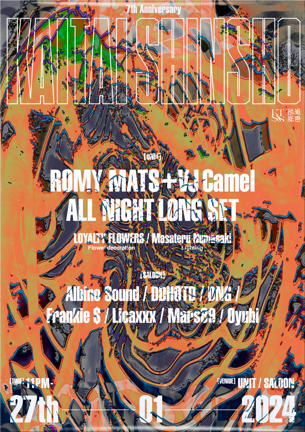UNITでは、「解体新書」共同創設者 / レジデントのRomy MatsとVJ Camelが初の“All Night Long Set”を敢行。Saloonでは、Albino Soundが“Hybrid set”を披露するほか、DDHOTD、DNG(CYK)、Frankie $、Licaxxx、Mars89、Oyubiが出演します。当日はLOYALTY FLOWERSがフラワー・デコレーション、沼崎正輝が照明を担当。フライヤー・デザインはグラフィック・デザイナーRyu Godaによるもの。前売チケットはZAIKOにて販売されています。