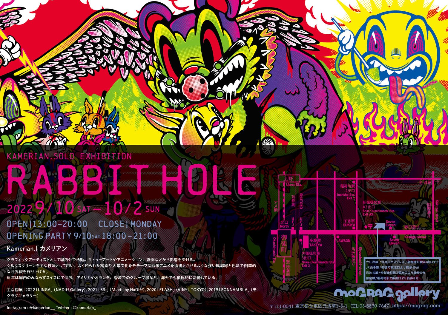 アメリカ、オランダ、スイス、香港など海外でも展示活動を行い、今年7月から8月にかけては東京・恵比寿 NADiff a/p/a/r/tにて個展「LINGA」を開催したグラフィック・アーティストKamerian.(カメリアン)が、ソロ・エキシビション「RABBIT HOLE」を東京・新御徒町 mograg galleryにて9月10日(土)から10月2日(日)まで開催。