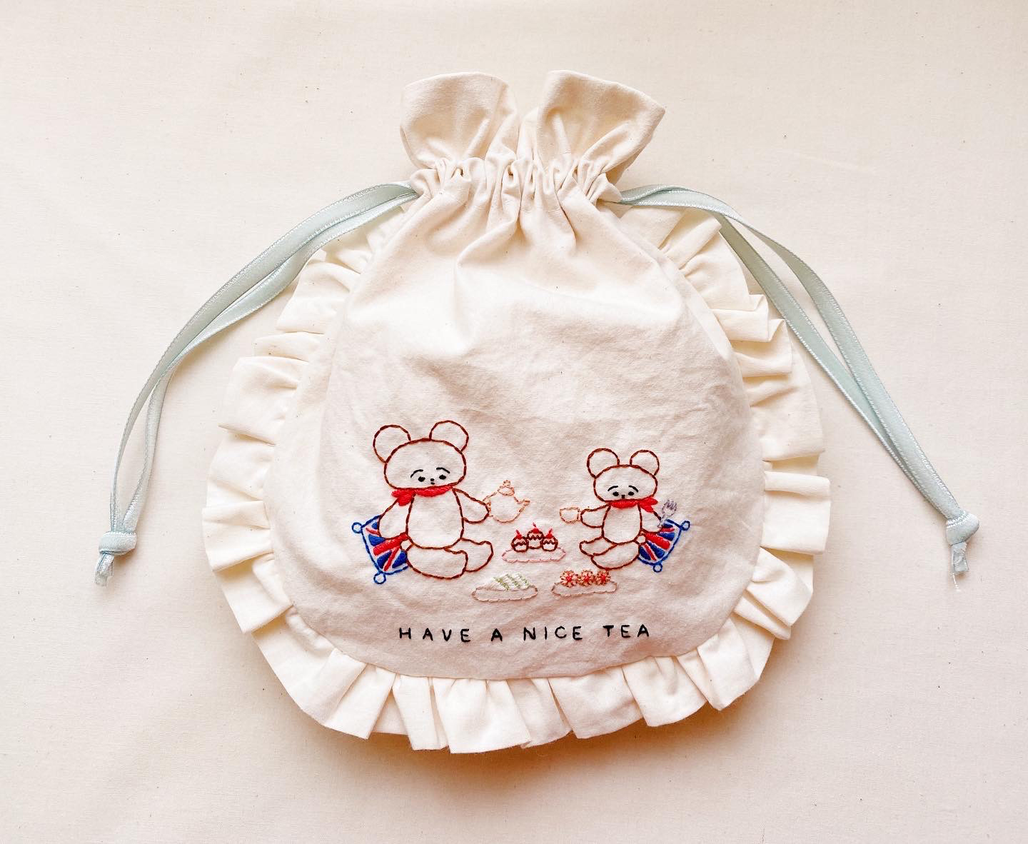 『刺繍でABC』の出版を記念して東京・南青山 あお山ヒュッテで開催された2020年の個展以来約2年ぶりとなる同展では“お茶会”をテーマに、刺繍があしらわれたフリル付き「お菓子BAG」を展示販売。お菓子BAGは、料理家 / 菓子研究家・星谷菜々(apron room)が展示のために制作した「お花のクッキーサンド」の詰め合わせが同梱されています。なお会場内ではマグカップも販売されるほか、来場者にはフリーペーパーを進呈。フリーペーパーには展示のテーマや作品紹介、Entaniおすすめのカフェや紅茶についてのテキストなどが掲載されているほか、“思い出のお菓子”を主題に笠尾美絵(SWEETCH)、神尾茉利(美術家)、鈴木いづみ(アーティスト)、多屋澄礼(DJ / ライター)、土屋あすか(amb100貨)がエッセイを寄稿しています。