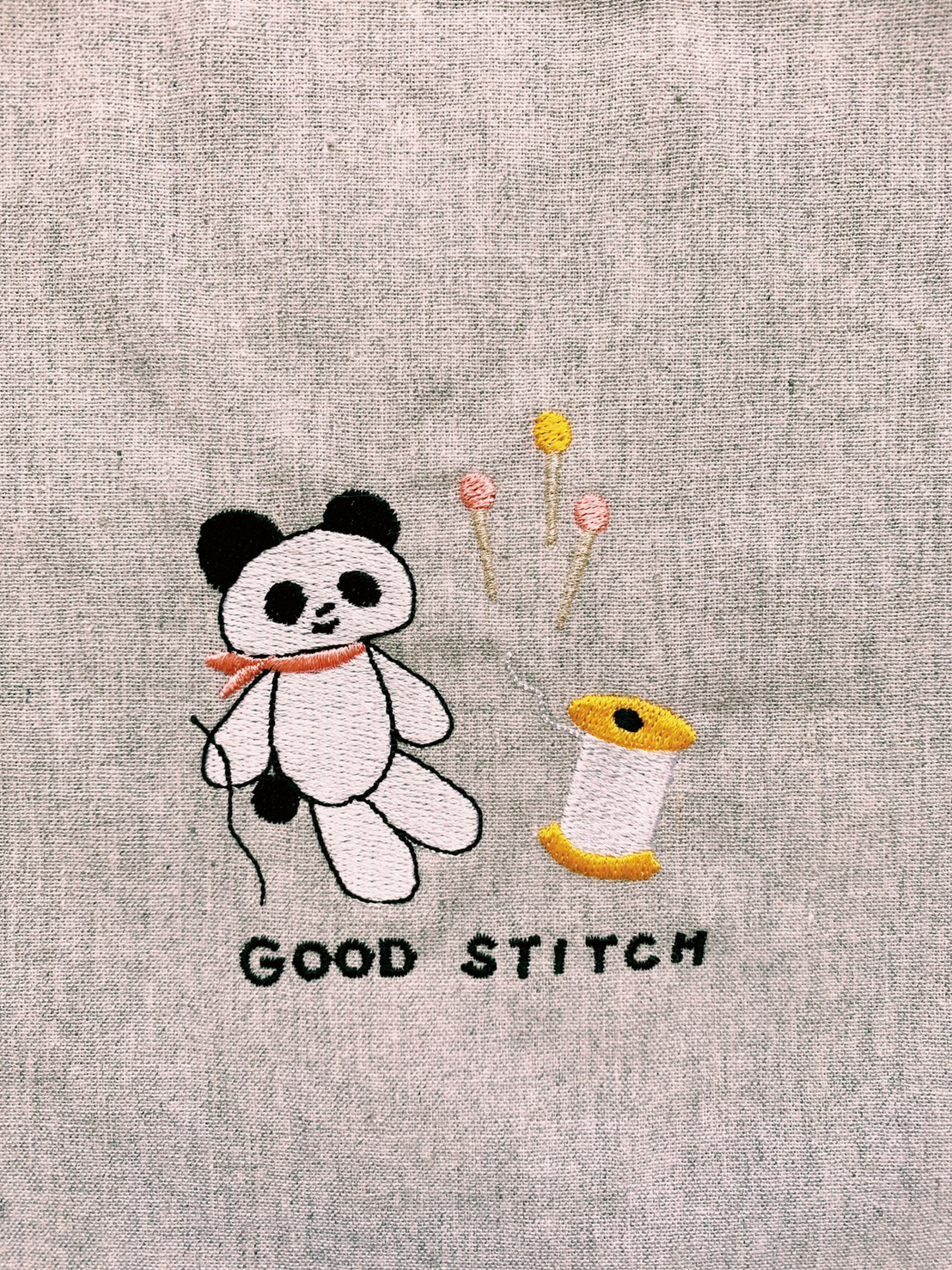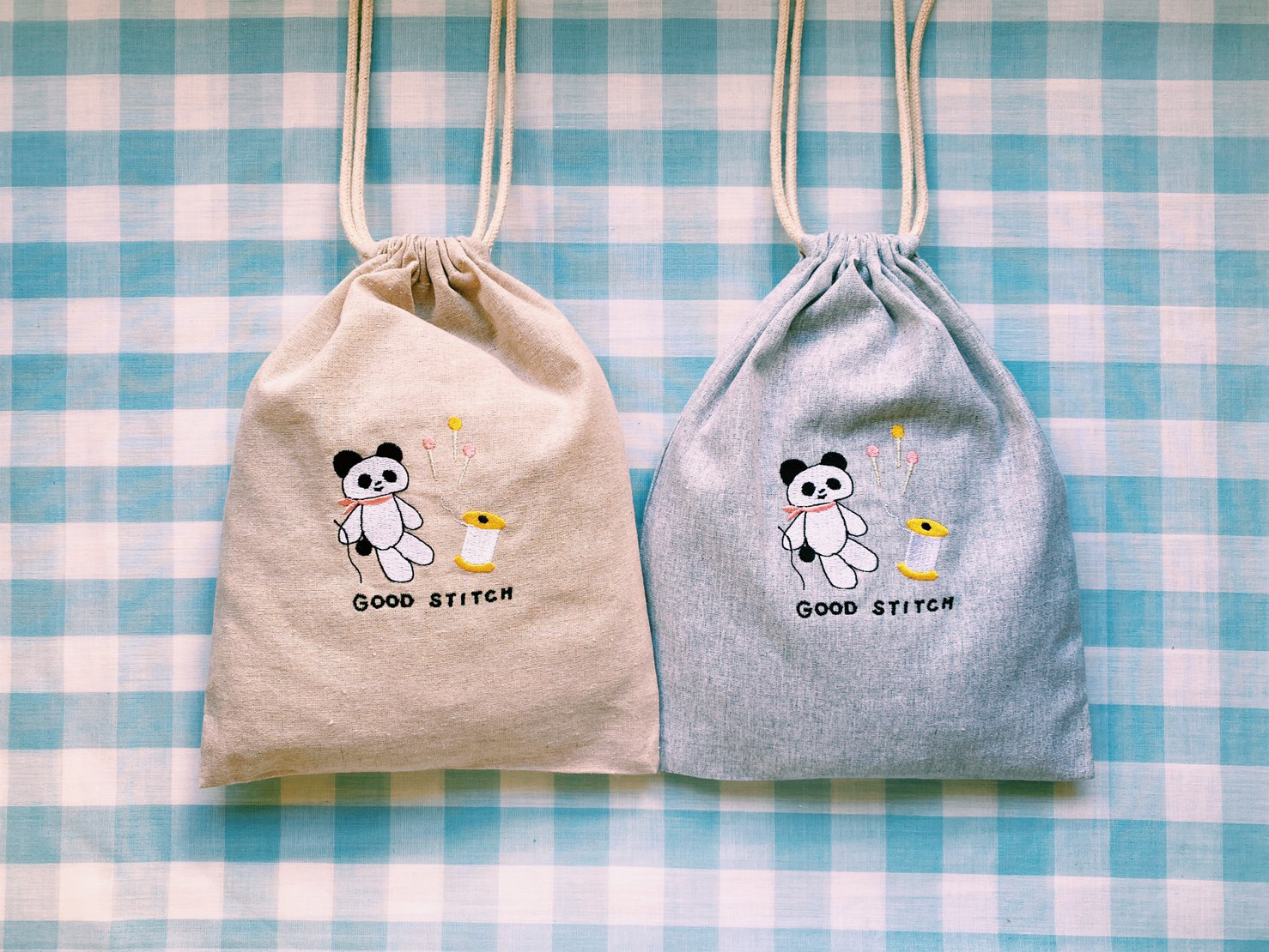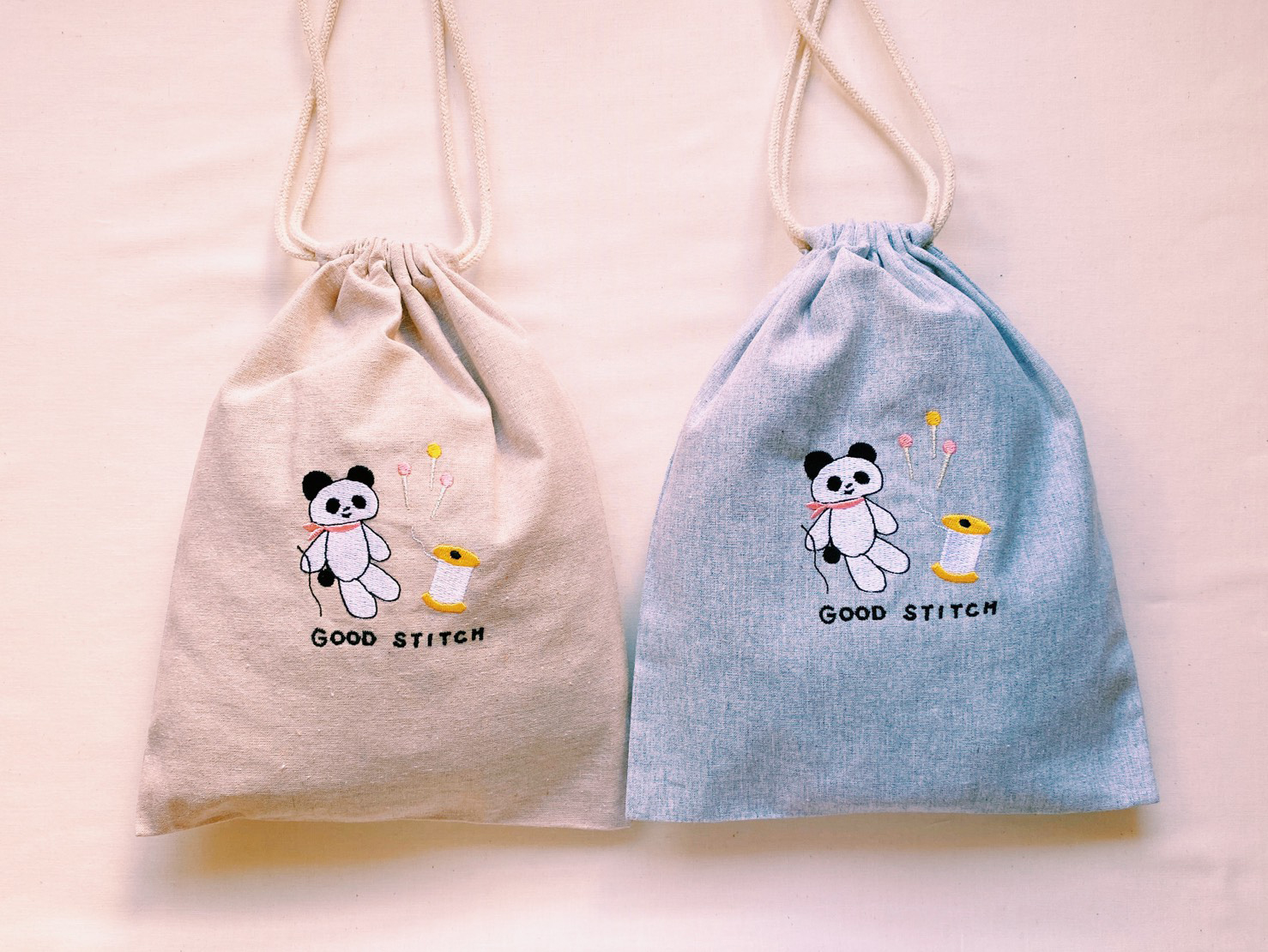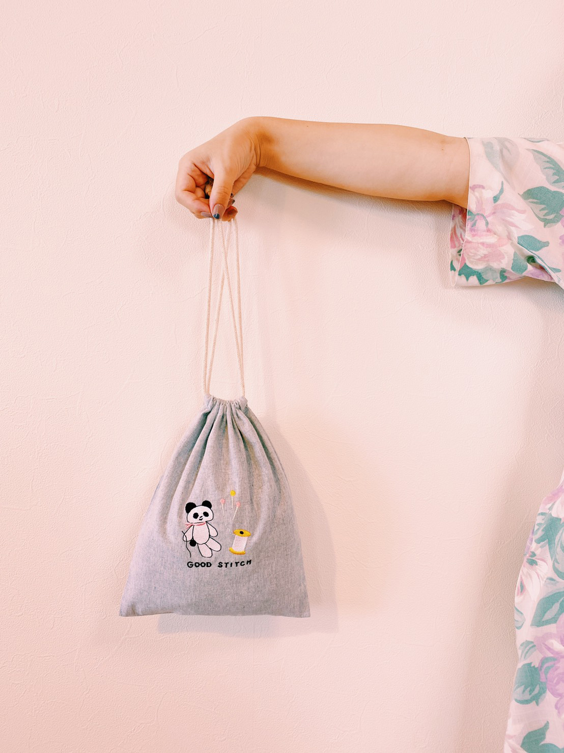 Kanae Entaniがデザインした刺繍をするパンダ「GOOD STITCH」の刺繍をあしらったドローストリングバッグ(巾着)です。