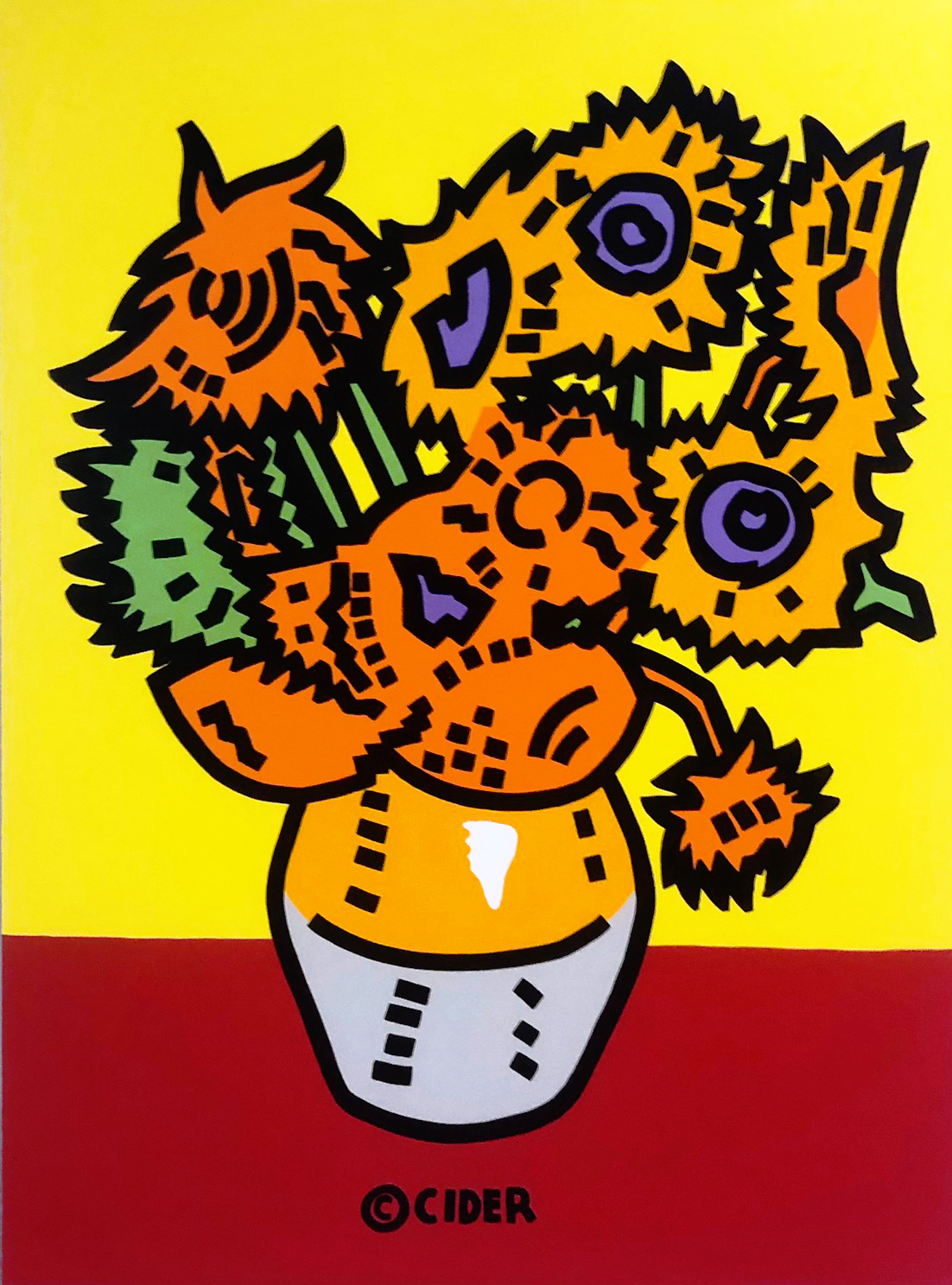 本展は、最初は仲間からの依頼に応じて開始し、徐々にカフェやレコード店でも発表するようになった、かせきさいだぁのアートワークを一挙にギャラリーで見せる初めての機会となります。「カワイイものが大好き」と公言する彼の作品は、その音楽と同様、「ポップな」スタイルで描かれる肖像や風景画ですが、そこにはゴッホやモネ、印象派、浮世絵からマンガやウォーホルまで、雑多な要素がかせきさいだぁ独自の翻訳を通じて宝石のように異種混交的な仕方で詰め込まれています。たとえば、彼の絵画では西洋近代絵画においては忌避される太い輪郭線で描かれていますが、ここには日本的な文脈である浮世絵やマンガを特徴づけるくっきりとしたアウトラインの影響を看取することができるでしょう。