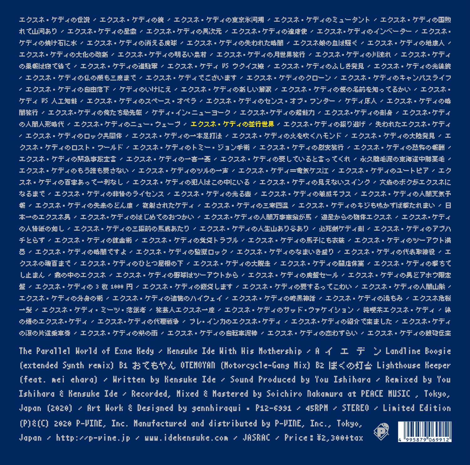 1stアルバム『井手健介と母船』(2015)以来約5年ぶりのフル・アルバム『Contact From Exne Kedy And The Poltergeists(エクスネ・ケディと騒がしい幽霊からのコンタクト)』を今年4月に発表した井手健介率いる“井手健介と母船”が、同作収録曲のセルフ・リミックス3曲を収録した12″ヴァイナル『The Parallel World of Exne Kedy(エクスネ・ケディの並行世界)』(P12-6991 2,300円 + 税)を12月23日(水)にリリース。画家 / イラストレーター / グラフィック・デザイナー・平木 元が手がけたカヴァー・アートが公開されています。