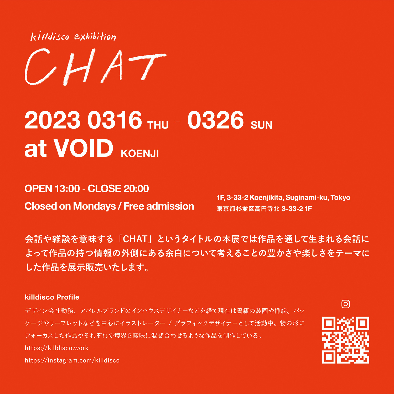 音楽作品のカヴァー・アートや書籍の装丁、食品のパッケージ・デザインなどでも活躍し、今年は1月から2月にかけて東京・末広町 PARK GALLERYにて開催されたグループ展「音楽」に参加しているイラストレーター・killdisco(キルディスコ)が、ソロ・エキシビション「CHAT」を東京・高円寺 VOIDにて3月16日(木)から26日(日)まで開催。