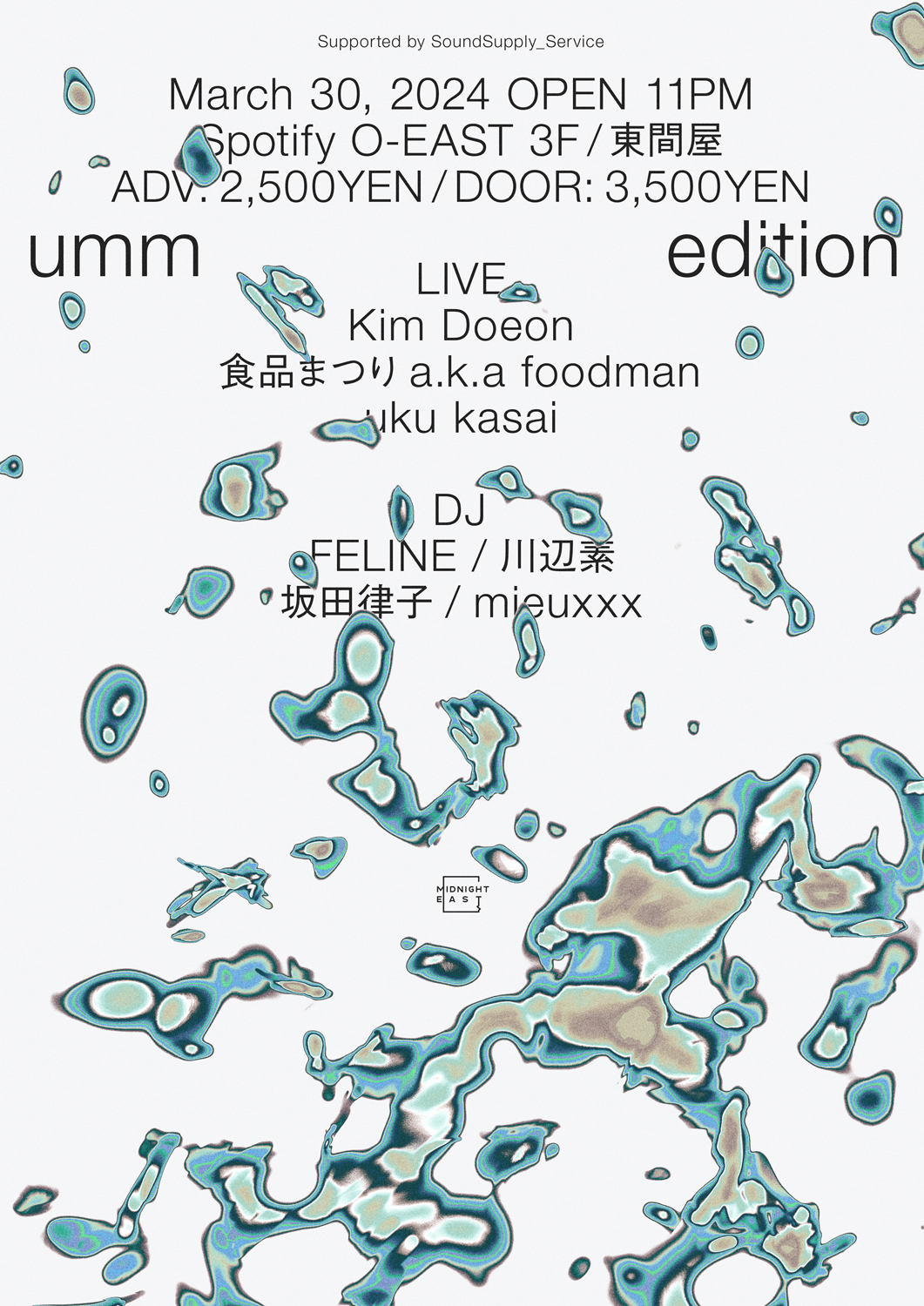 同公演ではKim Doeonに加え、「SoundSupply_Service」のレーベルメイト・Wonaが昨年発表したEP『Dream / Inter (Remixed)』にてリミキサーを務めた食品まつり a.k.a foodmanや、昨年はシングル『trline』の発表、初の自主企画「hi」(東京・南青山 WALL & WALL)の開催などが話題となったuku kasaiがライヴ・パフォーマンス。DJとしてFELINE、川辺 素(ミツメ)、寺沢美遊 aka mieuxxx(嫁入りランド)、坂田律子(fuelphonic)の出演が発表されています。