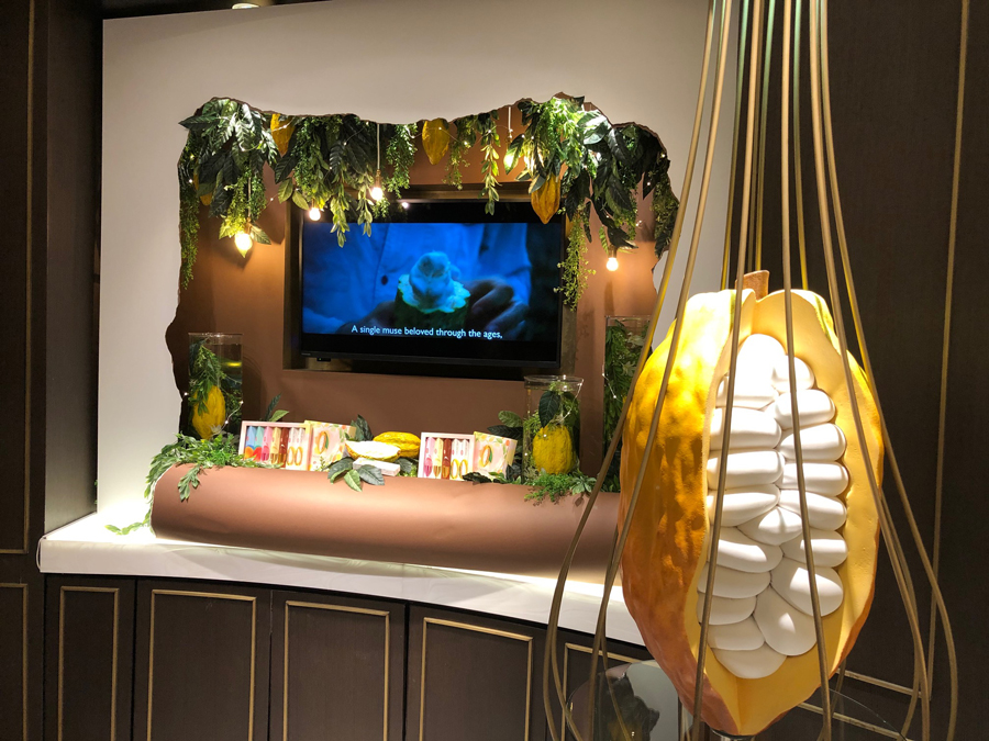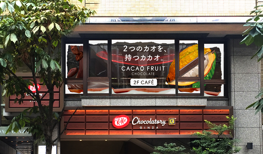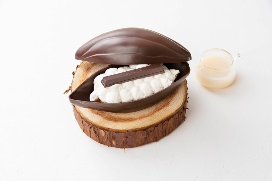 現在国内7店舗を展開するキットカット ショコラトリーは、2003年以来『キットカット』の開発に携わり、これまで数々の監修商品の開発を通して同商品の新しい魅力を発掘してきた「ル パティシエ タカギ」オーナー・シェフの髙木康政が全面監修した世界初の“キットカット専門店”。同店がサーブする『カカオフルーツ デセール』は、インパクト大の約20cm。カカオの果肉(パルプ)とカカオ豆の使用でカカオ本来のフルーティな甘みと酸味が味わえる『カカオフルーツチョコレート』(1本 400円, 5本 1,900円, 7本 2,500円 | キットカット ショコラトリー7店舗およびオンライン・ショップで販売)の魅力を伝えるべく、髙木シェフが創作した新作スペシャル・スイーツです。