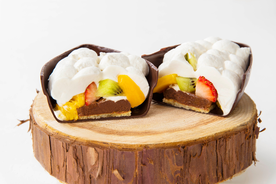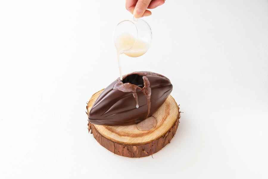 蓋部分には食べられる“カカオフルーツチョコレート”を使用し、果肉をイメージした内部には“カカオパルプジュース”を加えた生クリームと、イチゴやキウイなど7種のフルーツ、シェフ特製アーモンドのビスキュイ、チョコレート・クリームをイン。食べ進めた後に再びカカオポッドの蓋を閉じ、セットで提供する温かいカカオパルプジュースをかけることで、カカオフルーツチョコレートとジュースが混ざり合い、“カカオまるごと体験”が堪能できます。