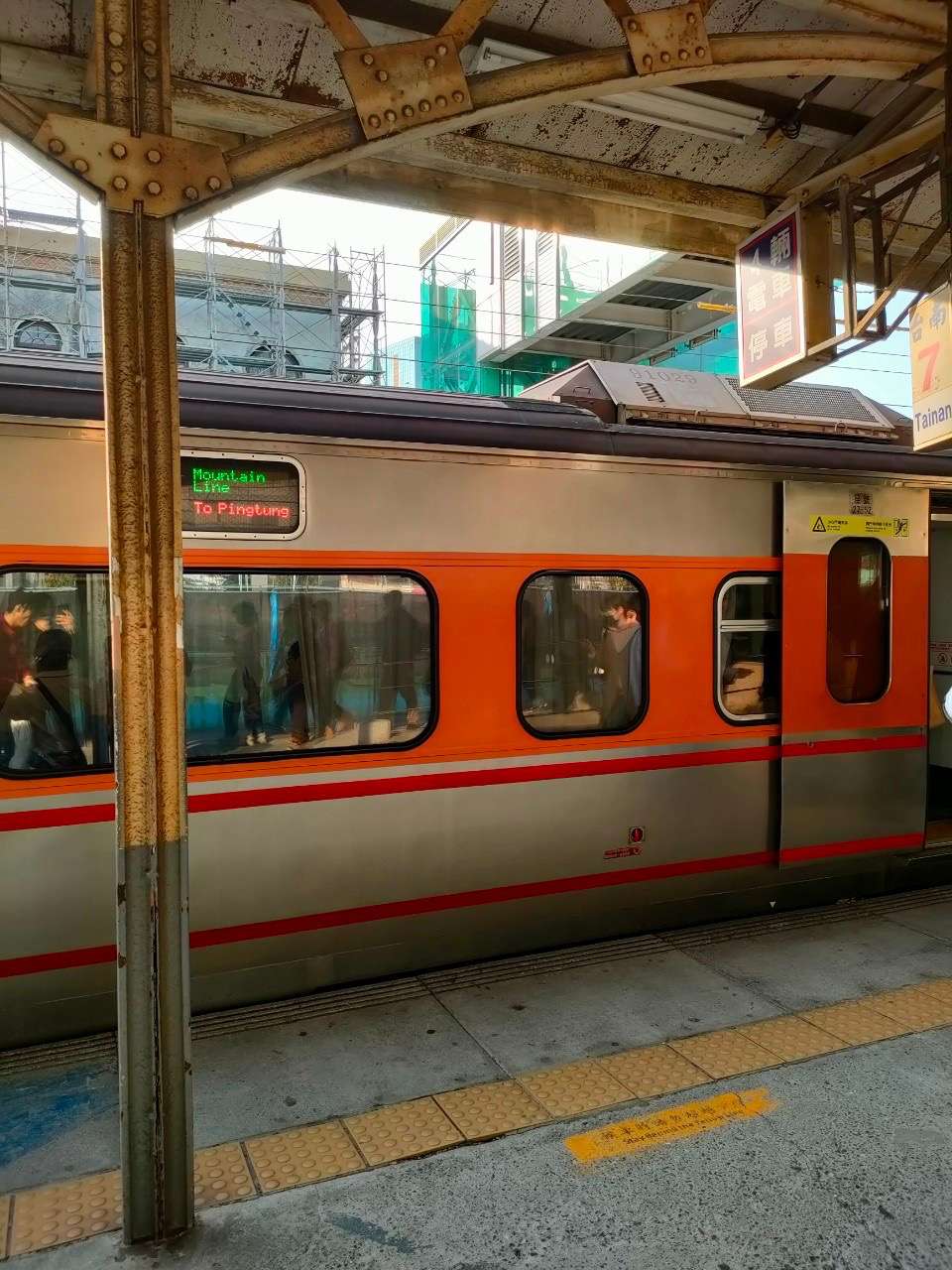 Willyと、そのパートナーであり、ツアー・ポスターやシャツのデザインを担当してくれた最高のデザイナー・Mudan(Mudan Yang 楊牡丹)がタクシーでピックアップしてくれて台北駅へ。今回の台北→台南への移動は特急電車。「高鐵」と呼ばれる台湾版新幹線だと1時間半くらいで着くらしいのですが、我々が乗った特急では4時間ほどかかりました。車内は少し古めの日本の新幹線を思い出させる感じですが、各席に足台が付いていてけっこう快適。台北→台南間の距離は約300kmほどで東京→名古屋よりも近く、あとで調べたら運賃は1人3,000円程度。電車だけでなくタクシーなどの移動手段も日本と比べてかなり格安です。ちなみに台北駅の駅弁が名物らしいのですが、売店が見つからず。仕方なく改札内の全家で適当に買った麻辣混ぜそば的なものを食べたのですが、コンビニ弁当としてはあり得ないくらい辛くて無事胃が死亡……。先が思いやられます。