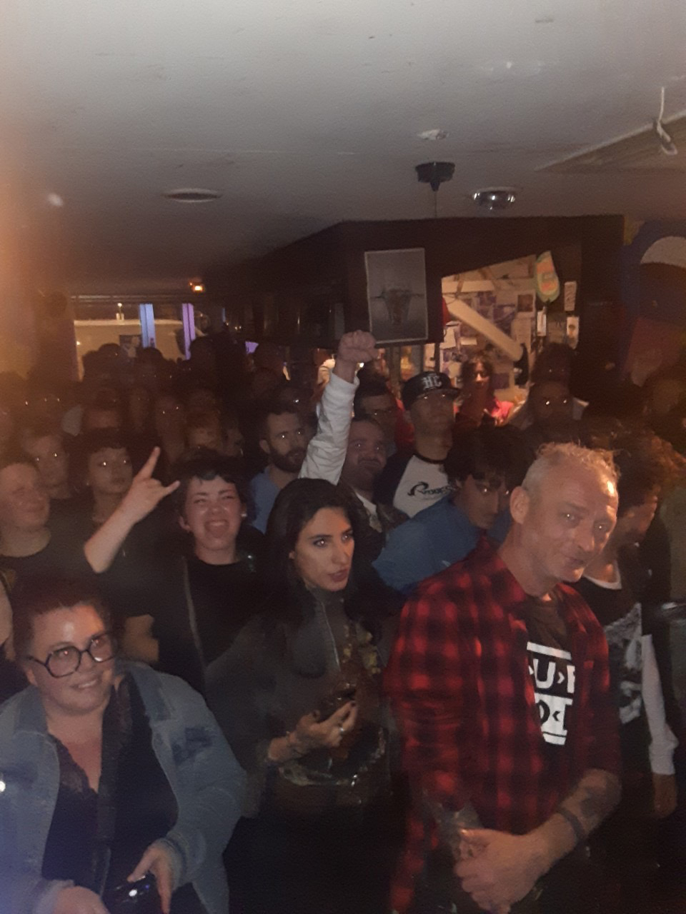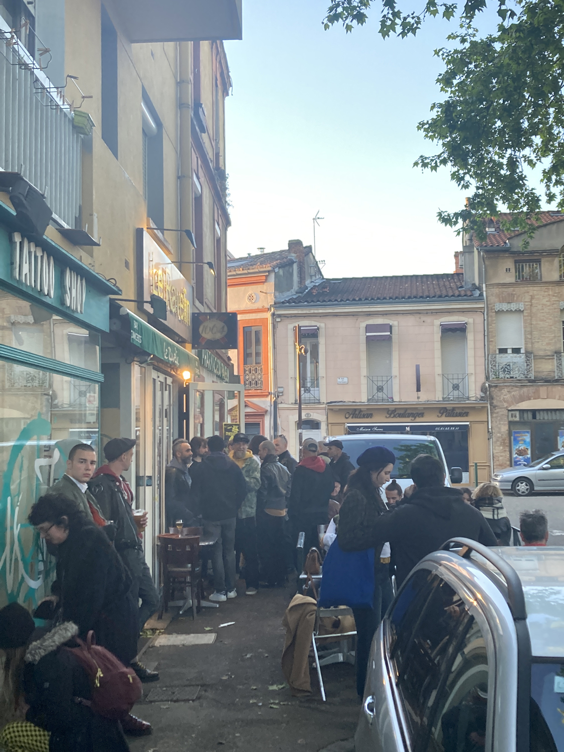 そうこうしているうちに会場オープン!正直、フランスの地方都市で、しかも平日2マン・ショウでお客さんとか来るのかなーと思っていましたが、そんな不安をよそに溢れかえる人々……。満員御礼で嬉し過ぎる。これは自分らの知名度云々ではなく、その地域のパンク・コミュニティやバンドがしっかりと、オープンな雰囲気で存在しているからだと感じました。そもそも会場も音漏れとか1mmも気にせず爆音が街中にダダ漏れという、物理的にもオープンな感じなんですが(笑)。