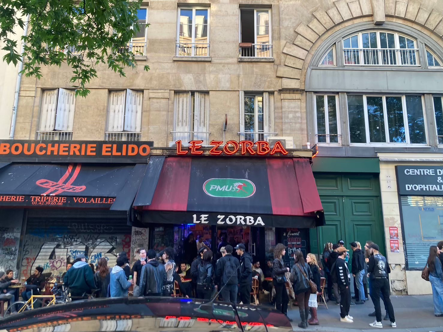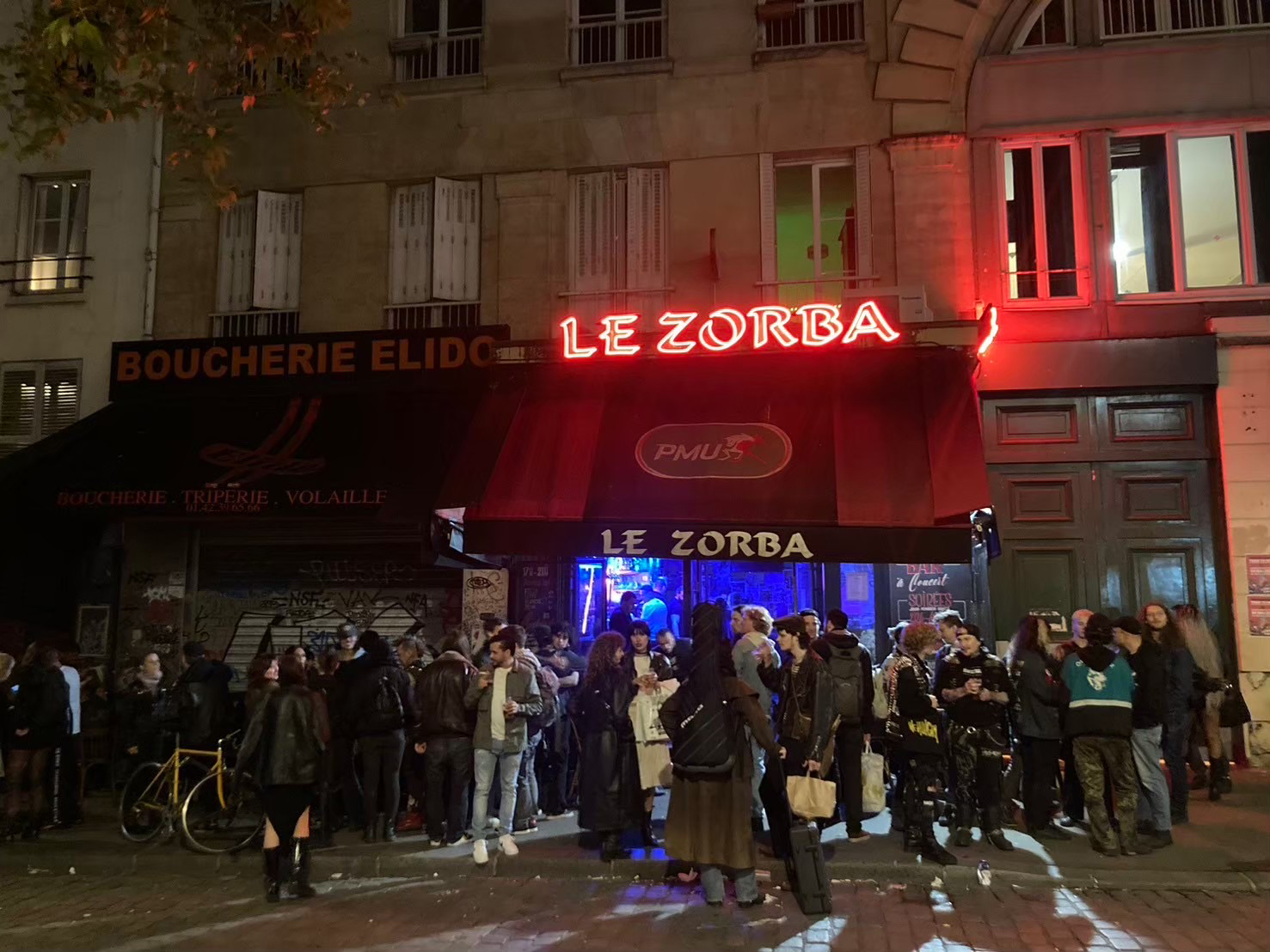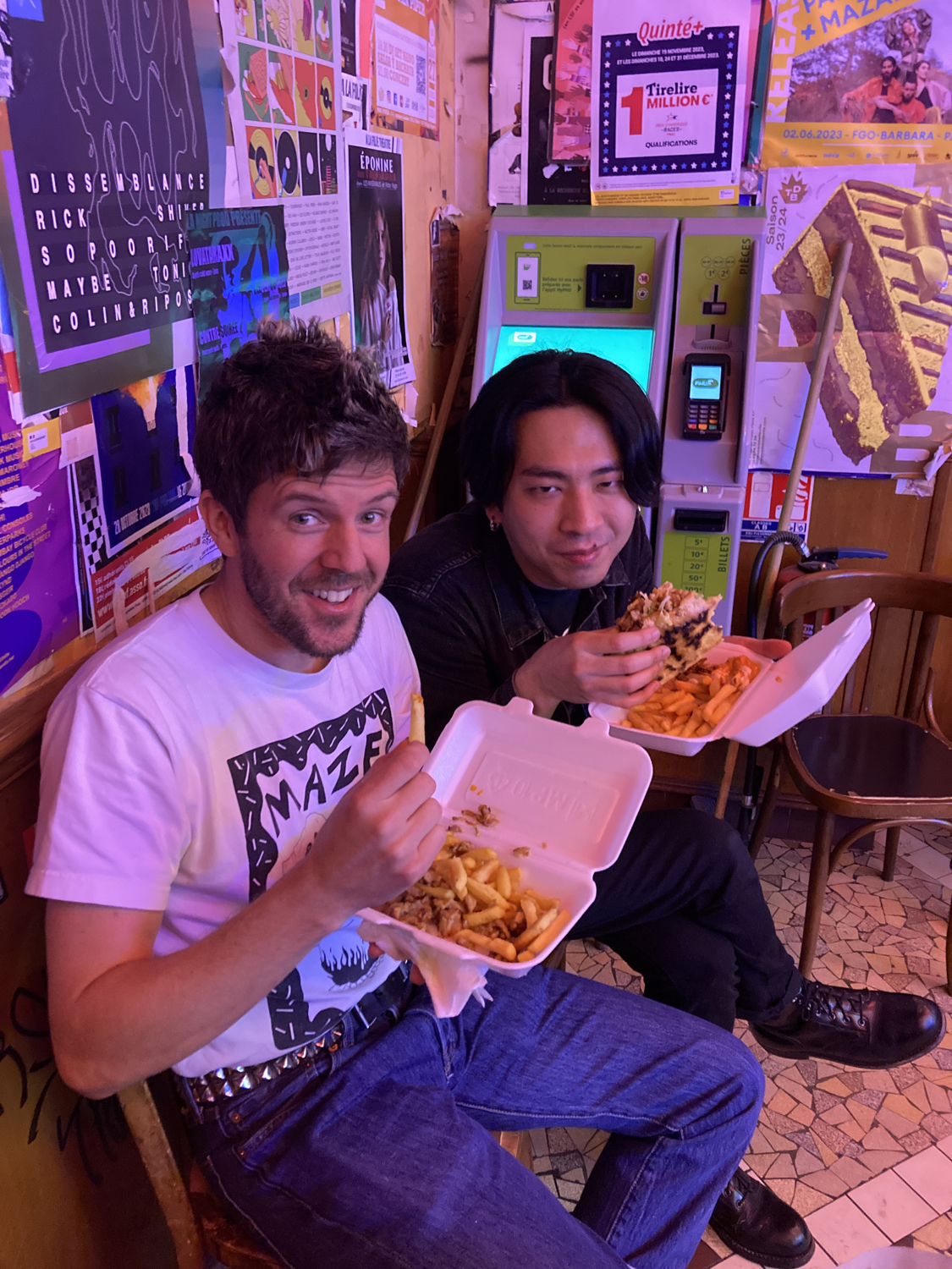 本日の会場はパリ10区に位置する「Le Zorba」。1階が普通にバーで、お客さんたちは競馬中継に熱中していました(笑)。馬券の券売機らしきものもありましたね。そして、地下へ続く階段を降りるとライヴ・スペースがある感じの作りでした。会場に到着した時点ですでにド派手なパンクスたちで溢れている……!しかもボロを履いているのに、なぜかめちゃくちゃおしゃれに見える……。もはやパンクというか完全に矢沢あいの世界観……。さすがパリっ子……と圧倒されていると、みんなとても親切で搬入をガッツリ手伝ってくれました。感謝。